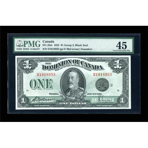 <B>DC-25m $1 1923</B></I><BR> A lovely example of this very rare note which displays great centering and little if any trace of circulation. PMG has very conservatively graded this note <B>Choice Extremely Fine 45, </B></I>making this the finest of the five examples graded to date by a very substantial margin. <BR><I>From The Thomas M. Flynn Collection</B></I><BR><BR><b>Shipping:</b> Coins & Currency (<a target="_blank" href="http://www.heritageauctions.com/common/shipping.php">view shipping information</a>)