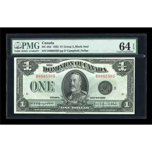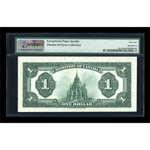 <B>DC-25n $1 1923</B></I><BR> This and the next note (the DC-25o E series) had by far the largest press run of any of the 1923 ones, and are the most common in high grade as well. This piece is a hair of left margin shy of the full Gem grade. PMG <B>Choice Uncirculated 64 EPQ.</B></I><BR><I>From The Thomas M. Flynn Collection</B></I><BR><BR><b>Shipping:</b> Coins & Currency (<a target="_blank" href="http://www.heritageauctions.com/common/shipping.php">view shipping information</a>)