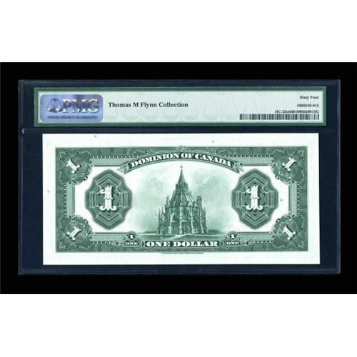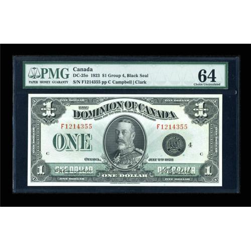 <B>DC-25o $1 1923</B></I><BR> This Group 4 black seal F series Campbell-Clark note was the last large size $1 printed. Only 2,000,000 pieces were produced, and relatively few were saved as production commenced during the depths of the Depression. PMG <B>Choice Uncirculated 64,</B></I> a nicely centered example with great color and eye appeal. <BR><I>From The Thomas M. Flynn Collection</B></I><BR><BR><b>Shipping:</b> Coins & Currency (<a target="_blank" href="http://www.heritageauctions.com/common/shipping.php">view shipping information</a>)