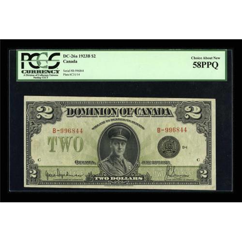 <B>DC-26a $2 1923B</B></I><BR> A "B" series note from Group 1 of the first set of Twos printed in 1923. H.R.H. the Prince of Wales is pictured at center in the uniform of the Welsh guards. <B>PCGS Choice About New 58PPQ.</B></I><BR><BR><b>Shipping:</b> Coins & Currency (<a target="_blank" href="http://www.heritageauctions.com/common/shipping.php">view shipping information</a>)