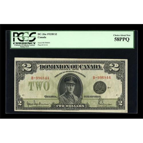 <B>DC-26a $2 1923</B></I>.<BR> A "B" series note from Group 1 of the first set of Twos printed in 1923. H.R.H. the Prince of Wales is pictured at center in the uniform of the Welsh guards. <B>PCGS Choice About New 58PPQ.</B></I><BR><BR><b>Shipping:</b> Coins & Currency (<a target="_blank" href="http://www.heritageauctions.com/common/shipping.php">view shipping information</a>)