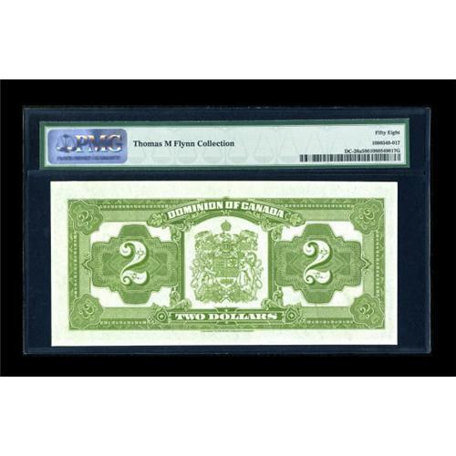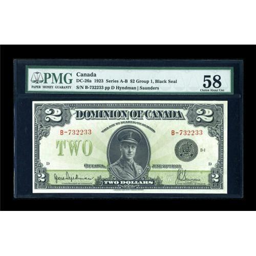 <B>DC-26a $2 1923</B></I><BR> The first of an impressive run of 1923 $2 notes, which depict H.R.H. The Prince of Wales in the uniform of the Welsh Guards in its central vignette. Like the $1 1923 notes, the $2 notes are divided into four groups by series letters and numerals. This example, from the first notes issued, is the Group 1 Black seal variety. PMG <B>Choice About Uncirculated 58, </B></I>a scarce note in this grade, and one which is by far the finest graded to date by PMG.<BR><I>From The Thomas M. Flynn Collection</B></I><BR><BR><b>Shipping:</b> Coins & Currency (<a target="_blank" href="http://www.heritageauctions.com/common/shipping.php">view shipping information</a>)