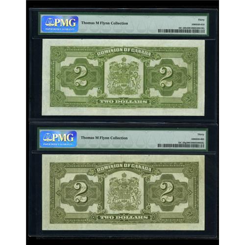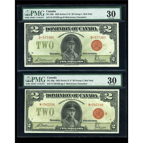 <B>DC-26b $2 1923<BR>DC-26g $2 1923</B></I><BR> A pair of 1923 $2 red seals, one Group 1 and one Group 2. Both have been graded <B>Very Fine 30 </B></I>by PMG and both are attractive and problem free circulated pieces.<BR><I>From The Thomas M. Flynn Collection</B></I><BR><BR><b>Shipping:</b> Coins & Currency (<a target="_blank" href="http://www.heritageauctions.com/common/shipping.php">view shipping information</a>)