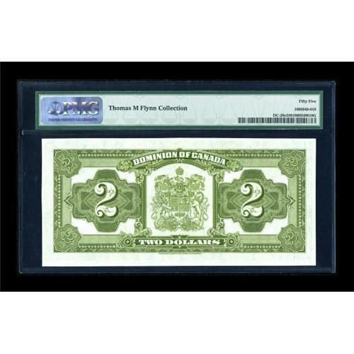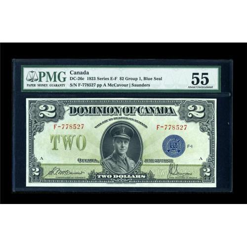 <B>DC-26c $2 1923</B></I><BR> This Group 1 blue seal example is a scarcer note, particularly in the higher grade ranges. PMG <B>About Uncirculated 55, </B></I>a bright and well printed piece.<BR><I>From The Thomas M. Flynn Collection</B></I><BR><BR><b>Shipping:</b> Coins & Currency (<a target="_blank" href="http://www.heritageauctions.com/common/shipping.php">view shipping information</a>)