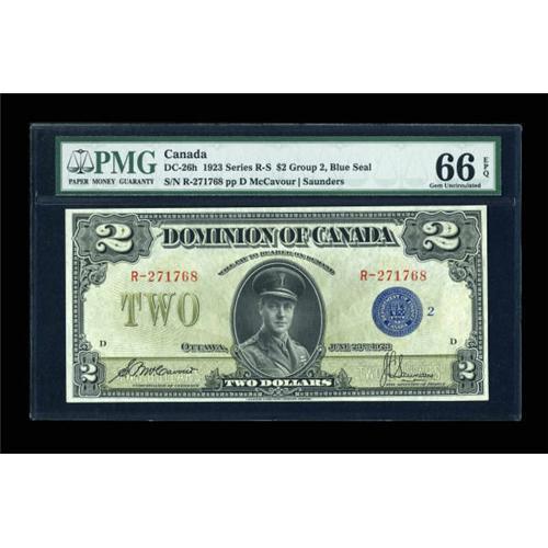 <B>DC-26h $2 1923</B></I><BR> This "R" prefix Group 2 blue seal may well be one of the finest examples of this issue extant regardless of group or seal. It's a well centered and fully original specimen that is one of only two <B>Gem Uncirculated 66 EPQ </B></I>notes that PMG has certified to date for this entire issue. If you collect and can afford only the finest, this is a note you should resolve to take home from this sale. <BR><I>From The Thomas M. Flynn Collection</B></I><BR><BR><b>Shipping:</b> Coins & Currency (<a target="_blank" href="http://www.heritageauctions.com/common/shipping.php">view shipping information</a>)