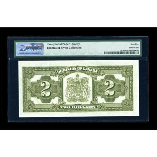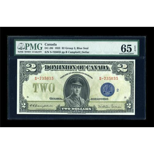 <B>DC-26i $2 1923</B></I><BR> Another in this run of high grade 1923 twos. This Group 2 blue seal is a tougher note, especially in this state of preservation. PMG <B>Gem Uncirculated 65 EPQ, </B></I>a fresh and original example fit for the finest of collections, and by far the finest specimen of this number PMG has graded to date.<BR><I>From The Thomas M. Flynn Collection</B></I><BR><BR><b>Shipping:</b> Coins & Currency (<a target="_blank" href="http://www.heritageauctions.com/common/shipping.php">view shipping information</a>)