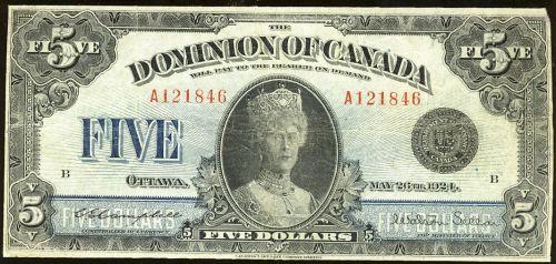 DC-27 1924 $5 A121846, The popular Queen Mary note. About Fine with a very minor corner nick. SCARCE!