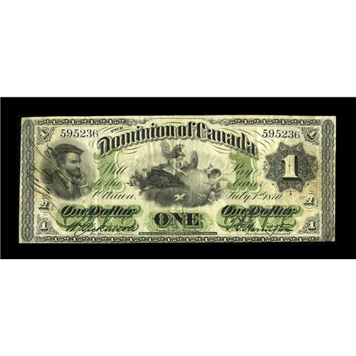 <B>DC-2a $1 1878</B></I><BR>This is a newly discovered example from the New England cash hoard, which consisted of both U.S. and Canadian notes from the 1860's through the 1880's. This note, from the first Dominion issue, is payable at Montreal. It's considerably nicer than the example we sold as part of the Halton Lake collection this past September, which realized $1610. Bright and problem free <B>Fine-Very Fine.</B></I><BR><BR><b>Shipping:</b> Coin/Currency (<a target="_blank" href="http://www.heritageauctions.com/common/shipping.php">view shipping information</a>)