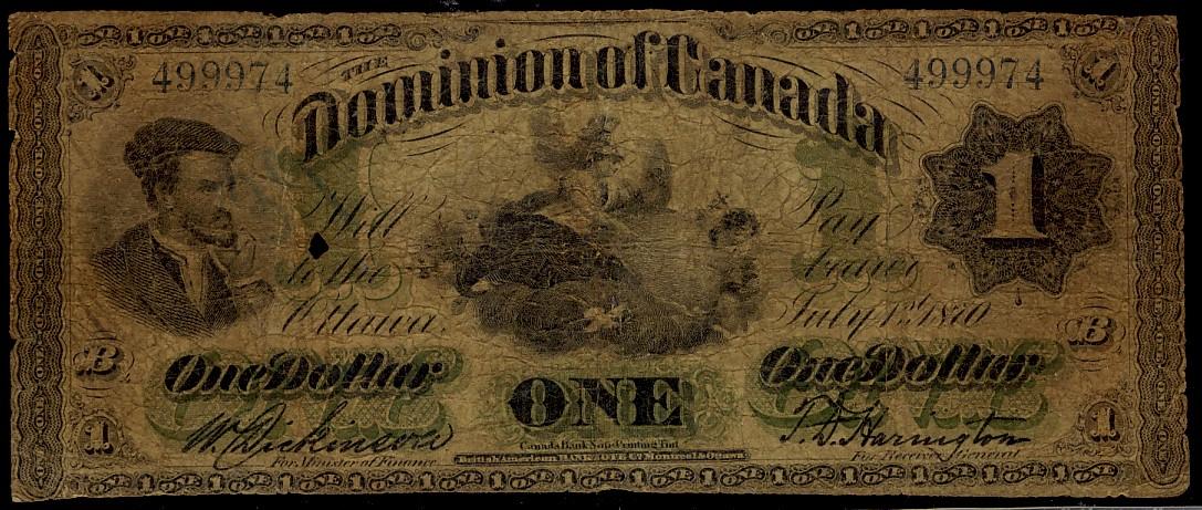 DC-2ai 1870 $1 Montreal, LD No.499974, internal hole at left