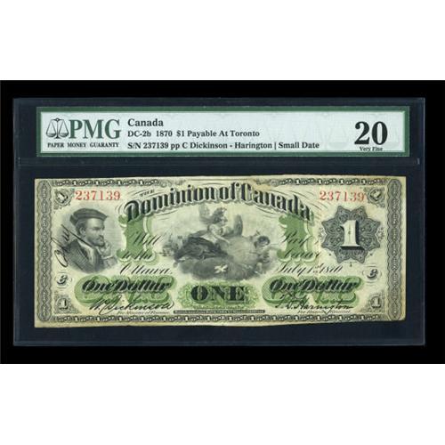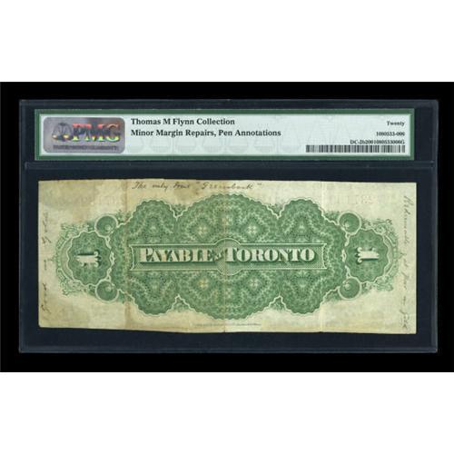 <B>DC-2b $1 1870</B></I><BR> A nice grade small date piece which is payable at Toronto. PMG <B>Very Fine 20,</B></I> with the notations "Minor Margin Repairs, Pen Annotations." The manuscript annotations are interesting contemporary comments on the back including "The only true Greenback," "Redeemable at par in Gold," and "Good as Gold," with the latter two comments undeniably true, as notes of this issue were indeed redeemable in gold. <BR><I>From The Thomas M. Flynn Collection</B></I><BR><BR><b>Shipping:</b> Coins & Currency (<a target="_blank" href="http://www.heritageauctions.com/common/shipping.php">view shipping information</a>)