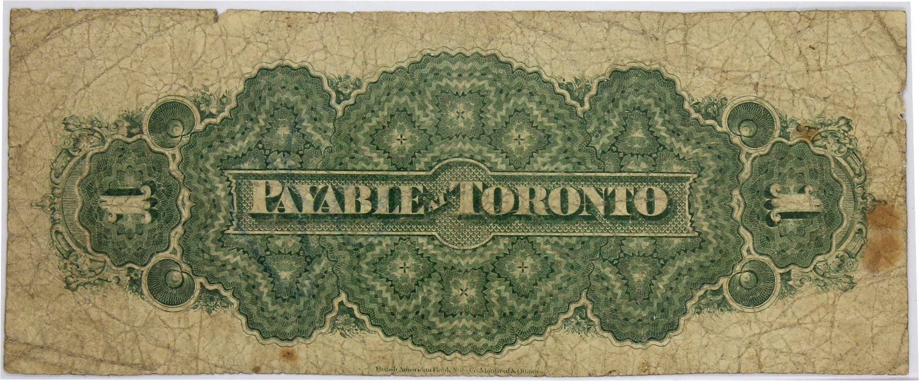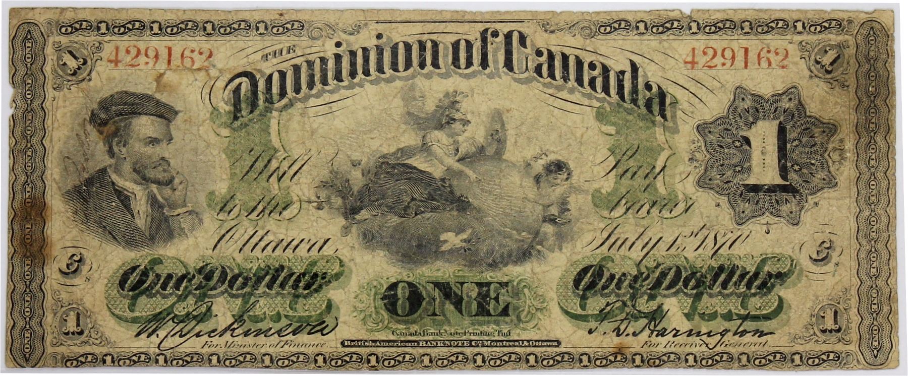 DC-2b-i 1870 Dominion Of Canada, $1 Toronto, Large Date Dickinson-Harrington, S/N: 429162-C. A Solid VG Note with minor imperfections *Scarce*.