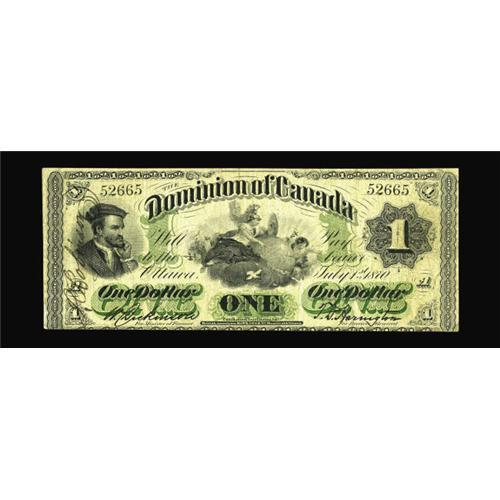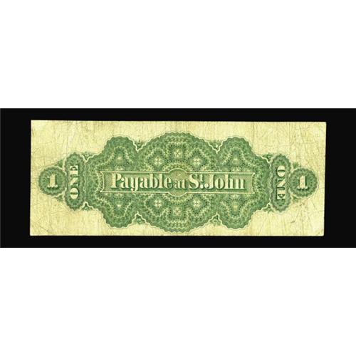 <B>DC-2c $1 1870</B></I><BR>This is another classic rarity, with this specimen being payable in St. John. This note is unpriced in the new Charlton catalogue in grades higher than Very Fine, and is seldom found better than Very Good. Pleasing <B>Fine,</B></I> with the bottom margin trimmed slightly into the design.<BR><I>From The Halton Lake Collection</B></I>