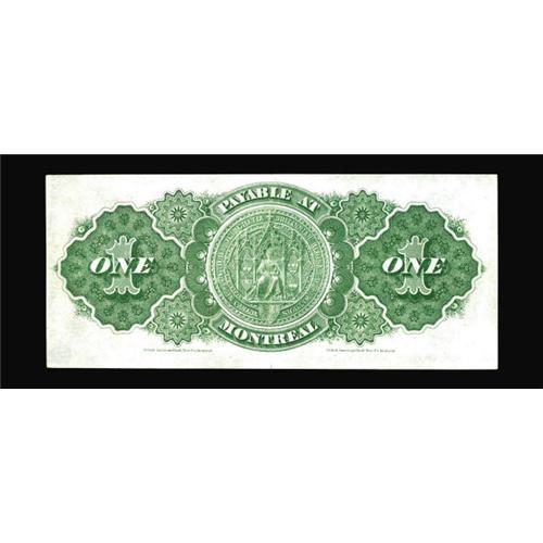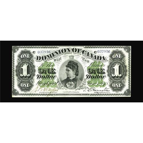 <B>DC-8a $1 1878</B></I><BR>As Charlton notes, the plausible reason for issuing this series was to combat counterfeiting of the 1870 Toronto $1 notes. What resulted was even more extensive counterfeiting, with the 1878 ones raised to fours and the 1878 twos plagued by spurious copies. This issue also started the tradition of picturing the Governor General and his wife on Dominion notes, with the $1 bearing the portrait of the Countess of Dufferin and the $2 the Earl of Dufferin, the Governor General of Canada from 1872 to 1878. This $1 example, payable at Montreal, is about as nice as these ever come. Bright <B>Extremely Fine-About Uncirculated.</B></I><BR><I>From The Halton Lake Collection</B></I>