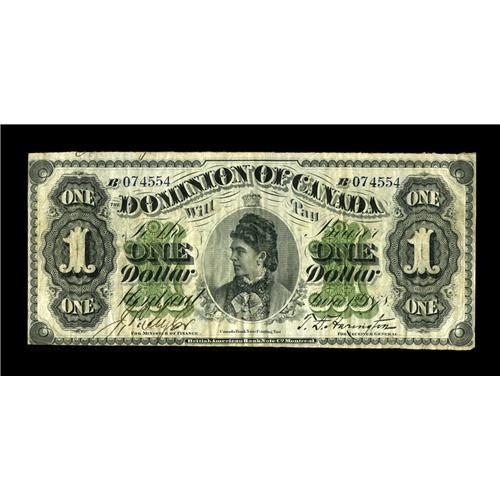 <B>DC-8a $1 1878</B></I><BR>As Charlton relates, the ostensible reason for issuing this series was to combat counterfeiting of the 1870 Toronto $1 notes. What resulted was even more extensive counterfeiting, with the 1878 ones raised to fours and the 1878 twos plagued by spurious copies. This issue also started the tradition of picturing the Governor General and his wife on Dominion notes, with the $1 bearing the portrait of the Countess of Dufferin and the $2 the Earl of Dufferin, the Governor General of Canada from 1872 to 1878. This attractive $1 example is payable at Montreal. <B>Fine-Very Fine.</B></I><BR><BR><b>Shipping:</b> Coin/Currency (<a target="_blank" href="http://www.heritageauctions.com/common/shipping.php">view shipping information</a>)
