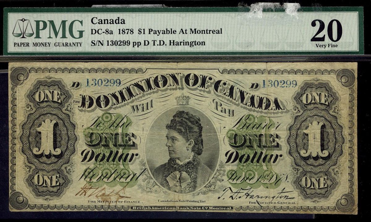DC-8a 1878 $1 Scallopped borders Montreal, S/N 130299 pp D PMG VF20. One of the best example ever seen and handled by TCNC. Rare. Only 10 examples are known.