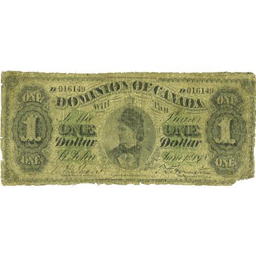 <B>DC-8c $1 1878</B></I><BR>Rare but ugly, with this payable at St. John specimen quite worn and missing its lower right corner. <B>Good.</B></I><BR><I>From The Halton Lake Collection</B></I>