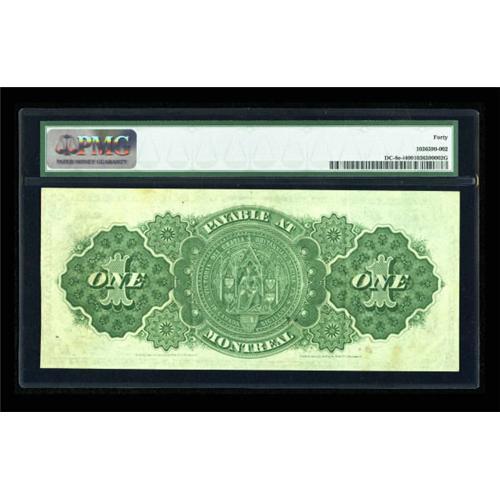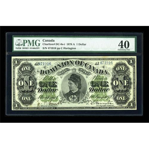 <B>DC-8e-i $1 1878</B></I><BR> As Charlton relates, the ostensible reason for issuing this series was to combat counterfeiting of the 1870 Toronto $1 notes. What resulted was even more extensive counterfeiting, with the 1878 Ones raised to Fours and the 1878 Twos plagued by spurious copies. This issue also started the tradition of picturing the Governor General and his wife on Dominion notes, with the $1 bearing the portrait of the Countess of Dufferin and the $2 the Earl of Dufferin, the Governor General of Canada from 1872 to 1878. This attractive PMG graded example is payable in Montreal. <B>PMG Extremely Fine 40, </B></I>a rare note in this grade.<BR><I><BR>From The John Ameen Collection</B></I><BR><BR><b>Shipping:</b> Coins & Currency (<a target="_blank" href="http://www.heritageauctions.com/common/shipping.php">view shipping information</a>)