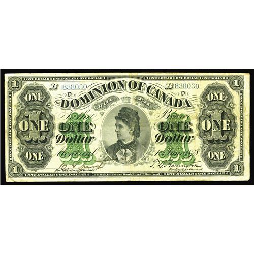 <B>DC-8e-ii $1 1878</B></I><BR>This clean note exhibits a bright decorative overprint on paper surfaces that remain crisp with one minor pinhole which is quite unusual for the issue. This Series B is also nicely centered. <B>Fine+.</B></I> <BR><BR><B>Impor