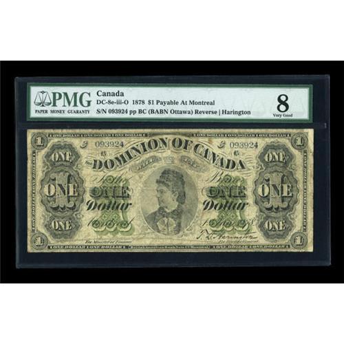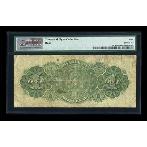 <B>DC-8e-iii-O $1 1878</B></I><BR> A well circulated but intact example of this payable at Montreal note with the Ottawa back imprint. PMG <B>Very Good 8,</B></I> with the comment "Rust," which is evident in a small patch on the reverse.<BR><I>From The Thomas M. Flynn Collection</B></I><BR><BR><b>Shipping:</b> Coins & Currency (<a target="_blank" href="http://www.heritageauctions.com/common/shipping.php">view shipping information</a>)