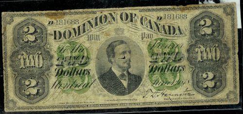 DC-9a 1878 $2 D181688 Montreal. A very rare note! Despite all catalogues, the Montreal issue is much scarce than the Toronto. About VG with a tiny hole at centre.