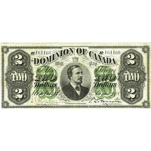 <B>DC-9a $2 1878</B></I><BR>This piece, bearing the portrait of the Earl of Dufferin, is a very scarce item in all grades and quite rare in grades above Fine. This example, which is payable at Montreal, displays good color for the grade. <B>Fine-Very Fine.</B></I><BR><I>From The Halton Lake Collection</B></I>