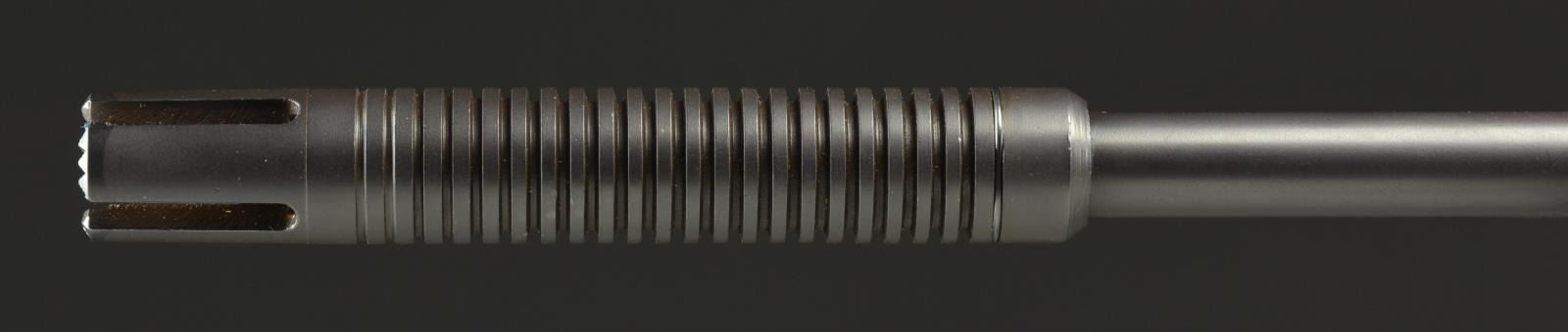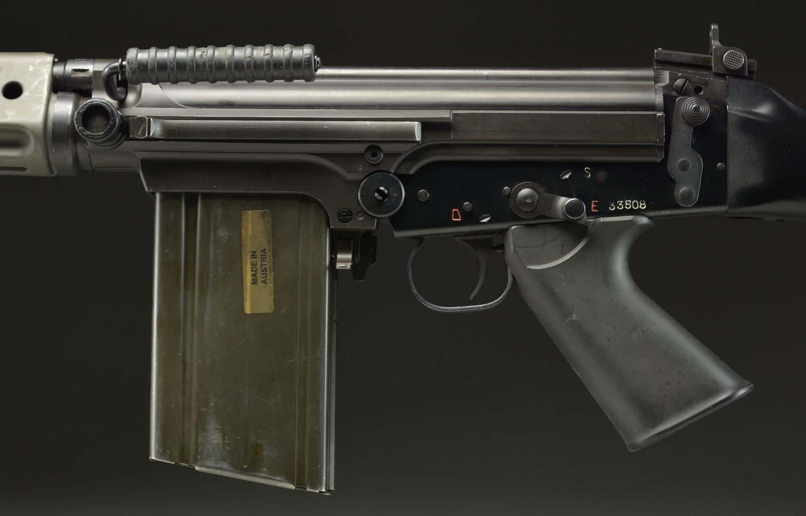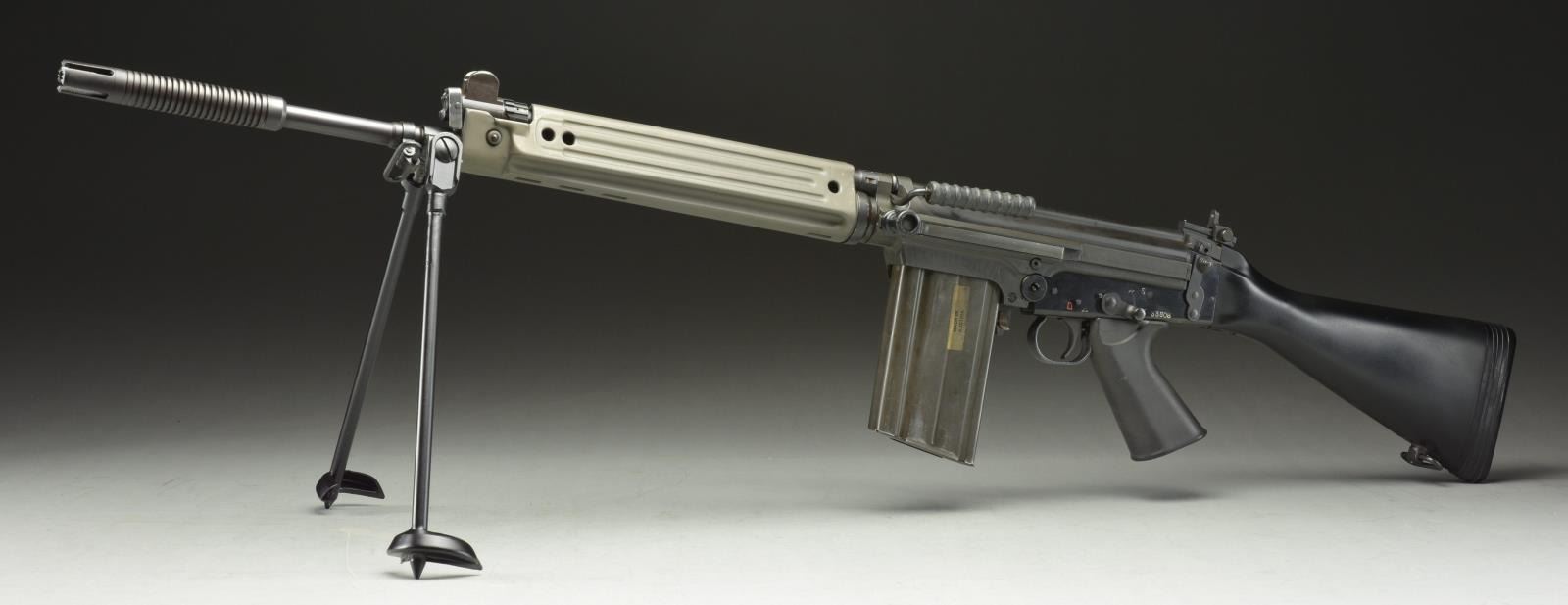 Cal. 308. S# 300152. Bbl. 22.5" over muzzle device. Metric FAL w/ steel German G1 handguard & bipod. Gas piston operated w/ protected post front sight & rear peep sight elevation adj. from 200-600m. Matte black finish on most exposed metal surfaces, w/ blued trigger group. 5.5" Flash hider/grenade launcher. Black plastic buttstock w/ recoil pad & corresponding plastic pistol grip. Left side lower receiver markings “33508” w/ S-E-D" safety selector markings. Right side upper receiver markings “D.C. INDUSTRIES, INC._SAINT PAUL, MN / MODEL DCI-LAR-1 CAL. 308 NO:300152”, Proper top folding carry handle above chamber w/ black rubber handle. Sling swivel rotates 360 degrees on bbl. in front of bipod. MAGS: 1 steel 20 rd. CONDITION: Finish is complete on all exposed metal parts showing very little sign of use. Some light thinning on top cover high spots. Stock & forend show almost no sign of use while pistol grip displays some rub marks as typically earned in vertical rack storage. Bore is bright w/ strong rifling. Fire control mechanism appears to function correctly when cycled by hand. (22-2603/JZ). MODERN. $1,000-1,500.
