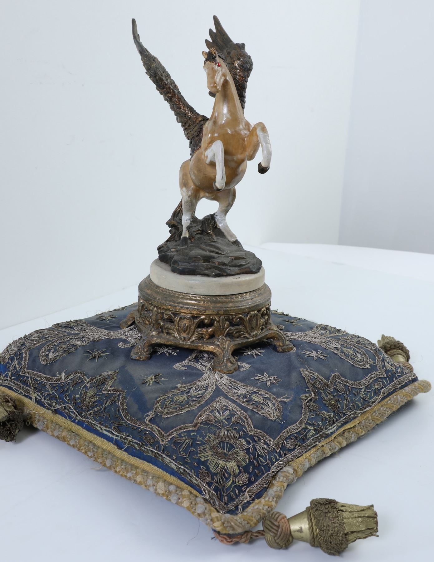 (Disneyland, c. 2000's-10's). A Disney California Adventure, Disney's Aladdin: A Musical Spectacular park used prop Pegasus statue and pillow. The items are in good condition with normal wear from age and park use. Measures approximately 16 x 16 x 17" tall. Item comes with a Grand Circle Tour Auctions COA.