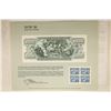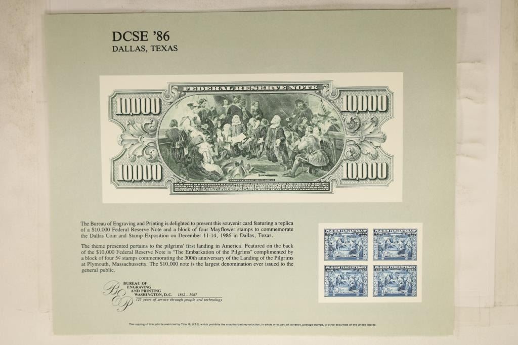 REPLICA OF THE REVERSE OF A $10,000 US FEDERAL RESERVE NOTE PLUS 4 PILGRIM STAMPS, PRINTED BY THE BUREAU OF ENGRAVING AND PRINTING
