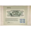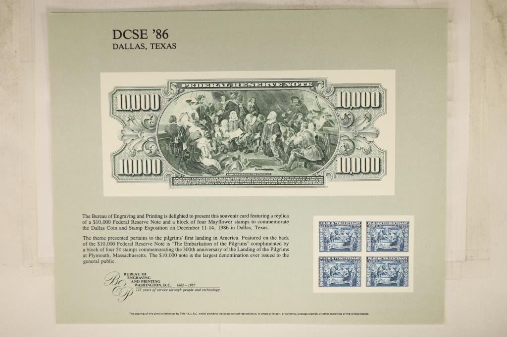 REVERSE OF A US $10,000 FRN PLUS PILGRIM STAMPS PRINTED BY THE BUREAU OF ENGRAVING AND PRINTING