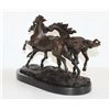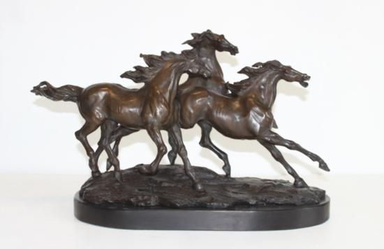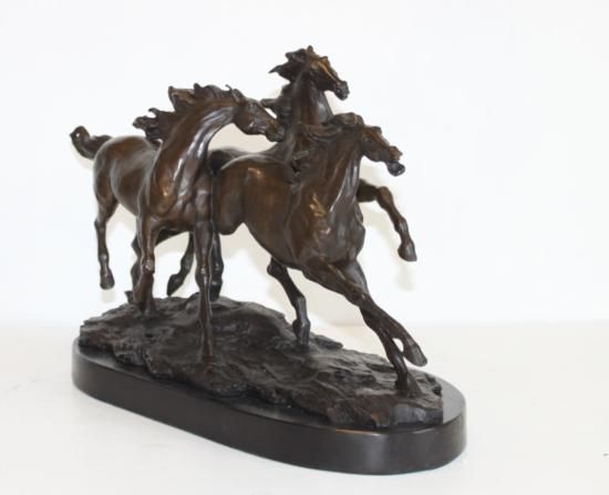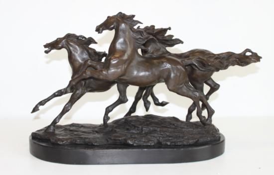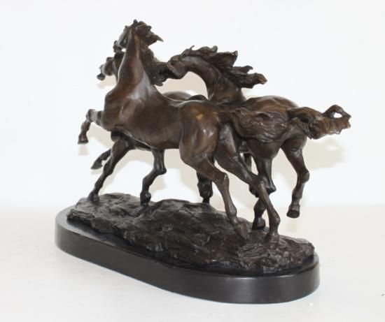 DDSM127 Amazing Wild Mustangs Bronze Sculpture, After Barye 11 x 18W x 7D 24 lbs This bronze sculpture was produced using the Lost Wax casting method. The Lost Wax Cast method is the most precise metal casting technique in existence, ensuring exquisite detail of the original host model which is usually sculpted in clay or wax. This Lost Wax casting method is an extremely labor intensive and expensive process, but the end results produce a Heirloom Quality Masterpiece!