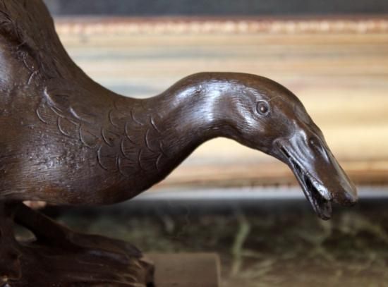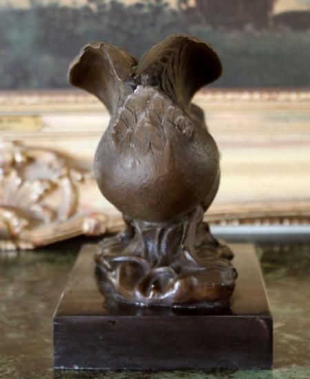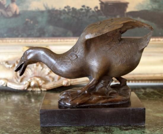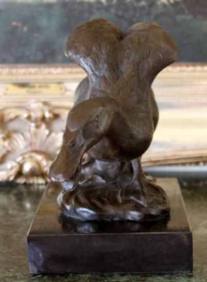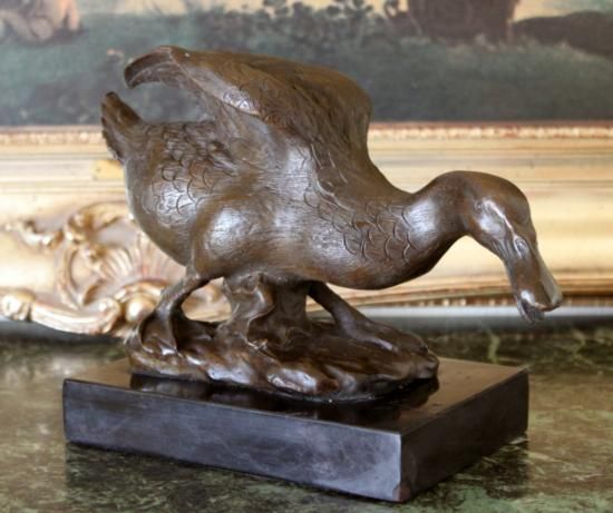 DDSM142 Delightful Duck Bronze Sculpture, After Debvt 7.5 H x 10.5 L x 5 D 15 lbs This bronze sculpture was produced using the Lost Wax casting method. The Lost Wax Cast method is the most precise metal casting technique in existence, ensuring exquisite detail of the original host model which is usually sculpted in clay or wax. This Lost Wax casting method is an extremely labor intensive and expensive process, but the end results produce a Heirloom Quality Masterpiece!