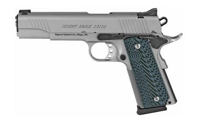 All Desert Eagle 1911 series 70 slide and frame rails are machined to aerospace tolerances, delivering accuracy that will match any custom gun. Offered in both Chrome Moly and Stainless and feature stainless match barrels, G-10 grips, light triggers with zero creep, and a stainless beavertail grip safety. The G (5" barrel) and C (4.33" barrel) models are equipped with fixed combat sights and the Undercover "U" (3" barrel) models come with an adjustable rear sight. Desert Eagle 1911s chambered in 45 ACP all have a traditional feed ramp machined into the frame, while all 9mm pistols have a ramped barrel with fully supported chamber. Only the 1911G models have a traditional barrel bushing in the slide. The 1911C and U models feature a bushingless slide and bull barrel. With the shorter slides of the C and U models, the bushingless slide allows for a longer recoil spring and ensures reliable function. Includes two 8-round magazines.