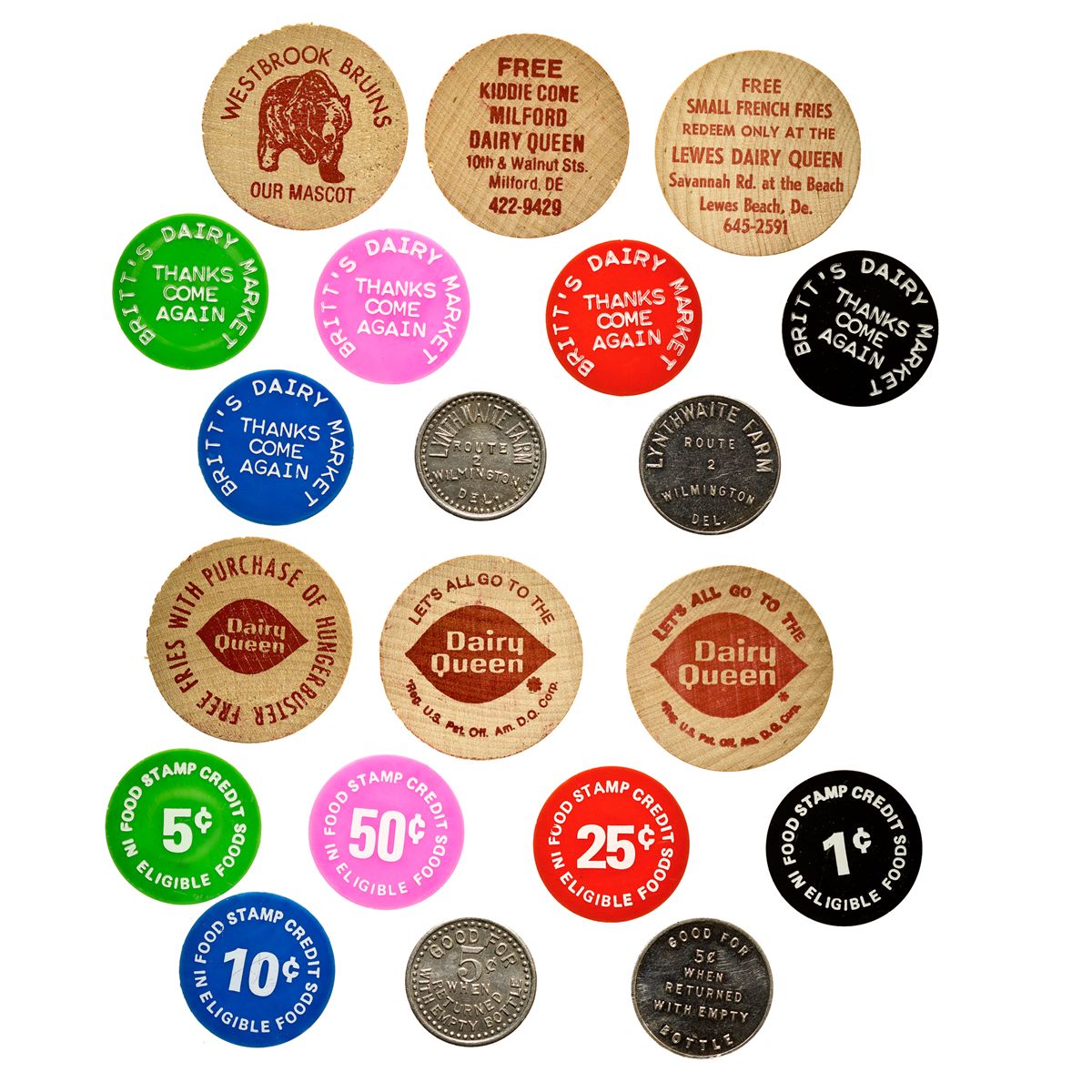 Lot of 10, including 3 wooden nickels from Dairy Queen, 5 plastic credit chips from Britt's Dairy Market and 2 pieces from Lynthwaite Farm of Wilmington. All are in very good condition.