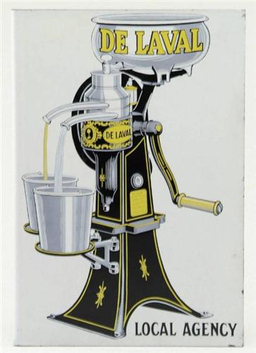DE LAVAL CREAM SEPARATOR PORCELAIN SIGN. Two-sided flange sign with cream separator graphics set against a white background. SIZE: 18" w x 26-1/2" h. CONDITION: Very good to excellent, retaining nice surface gloss and only a few small chips at bottom edge. 1-5581