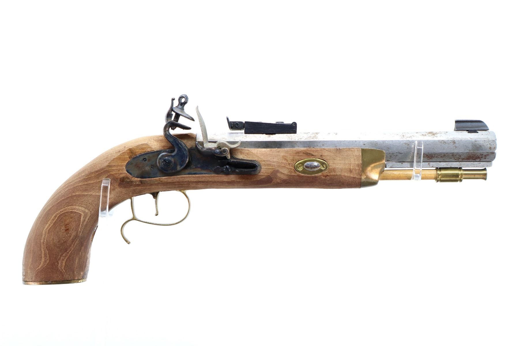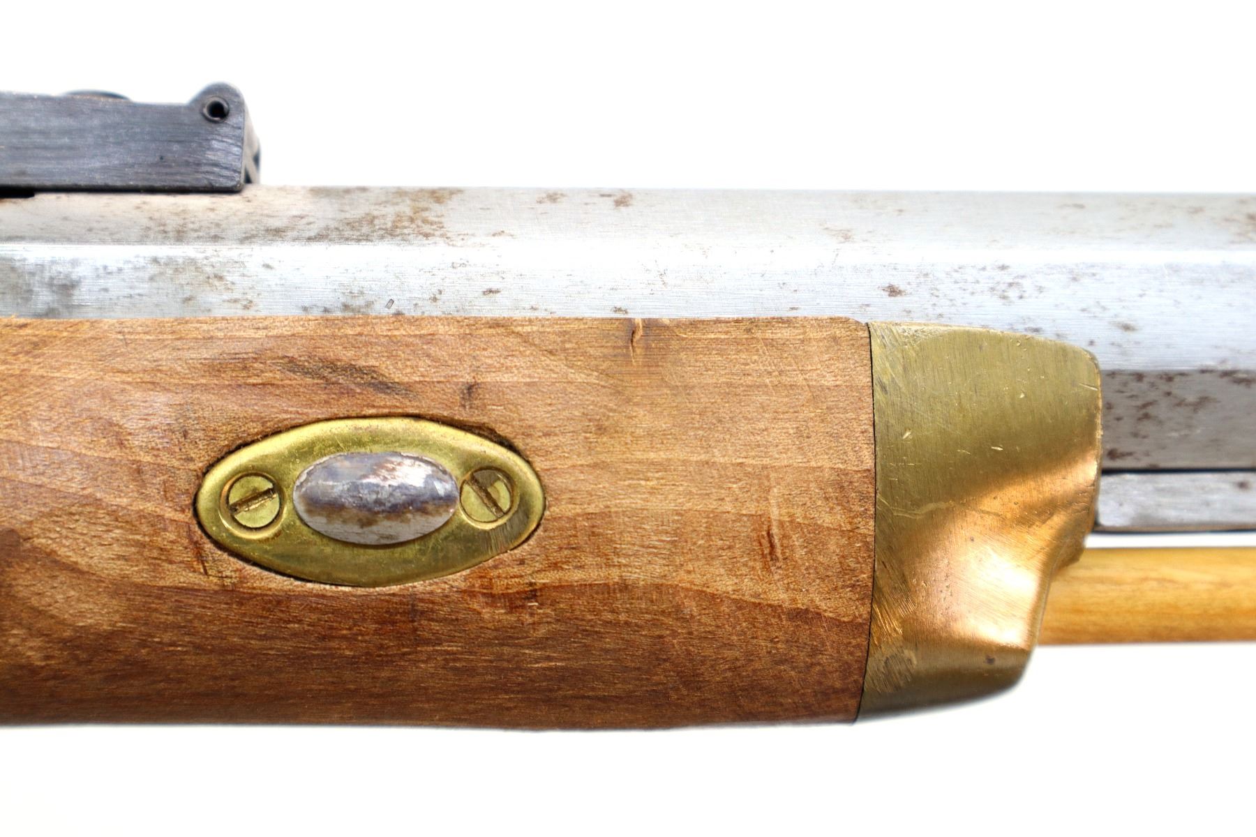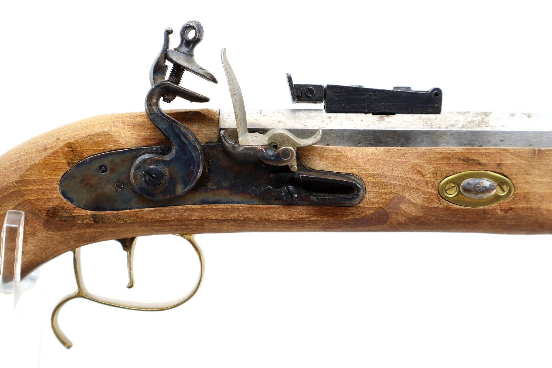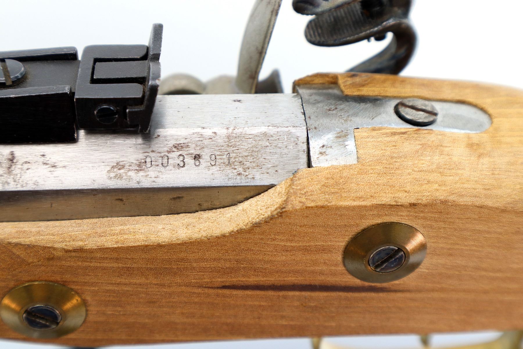 Main Description: This deactivation has 1 visible weld, action does not function. Blade front sight, adjustable u notched rear sight, octagon barrel, colour case hardened lock and hammer. One piece wood grip, single forearm wedge, engraved brass pommel cap, finger rest trigger guard, brass nose cap and wood ramrod with brass tip.