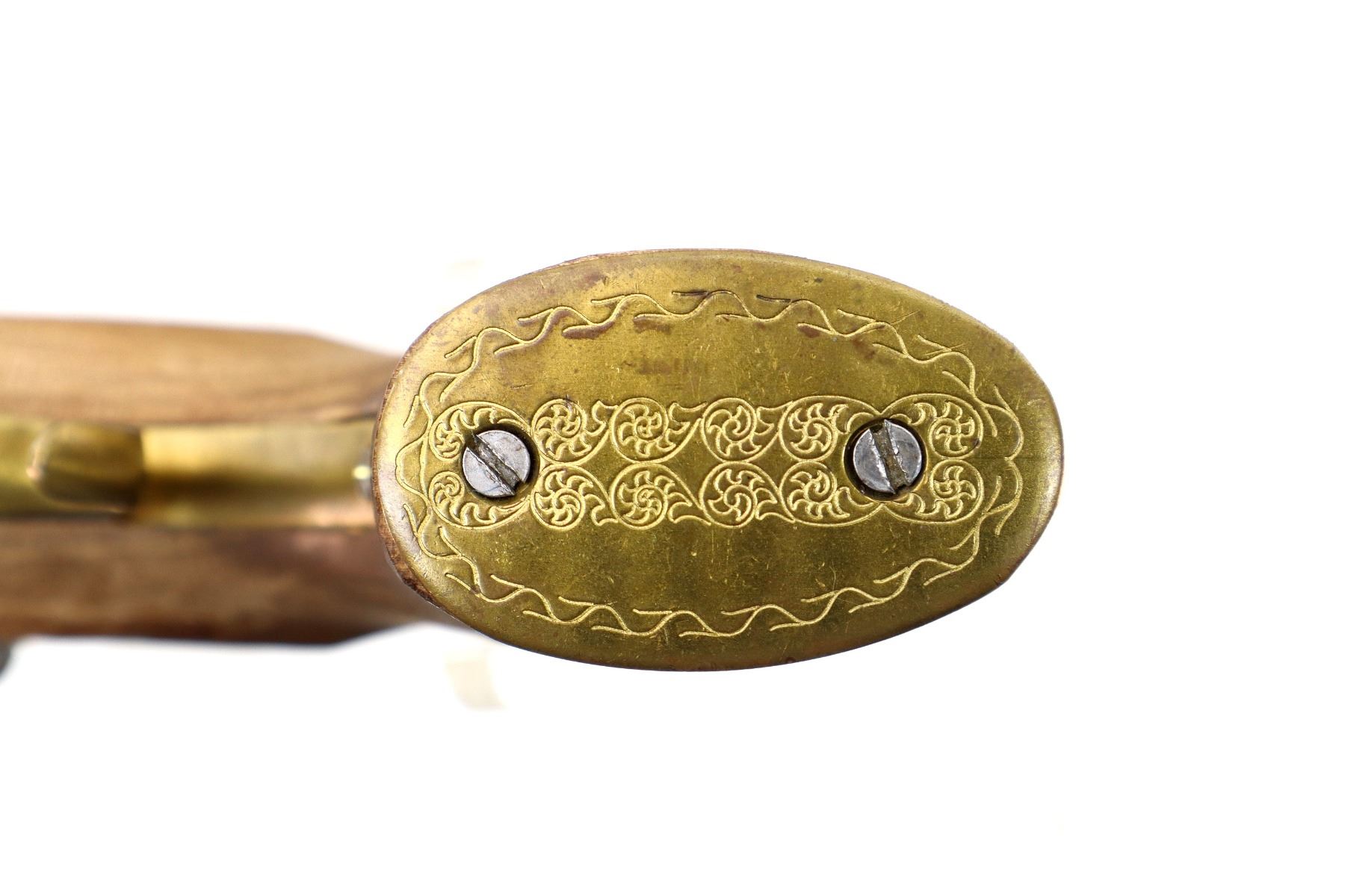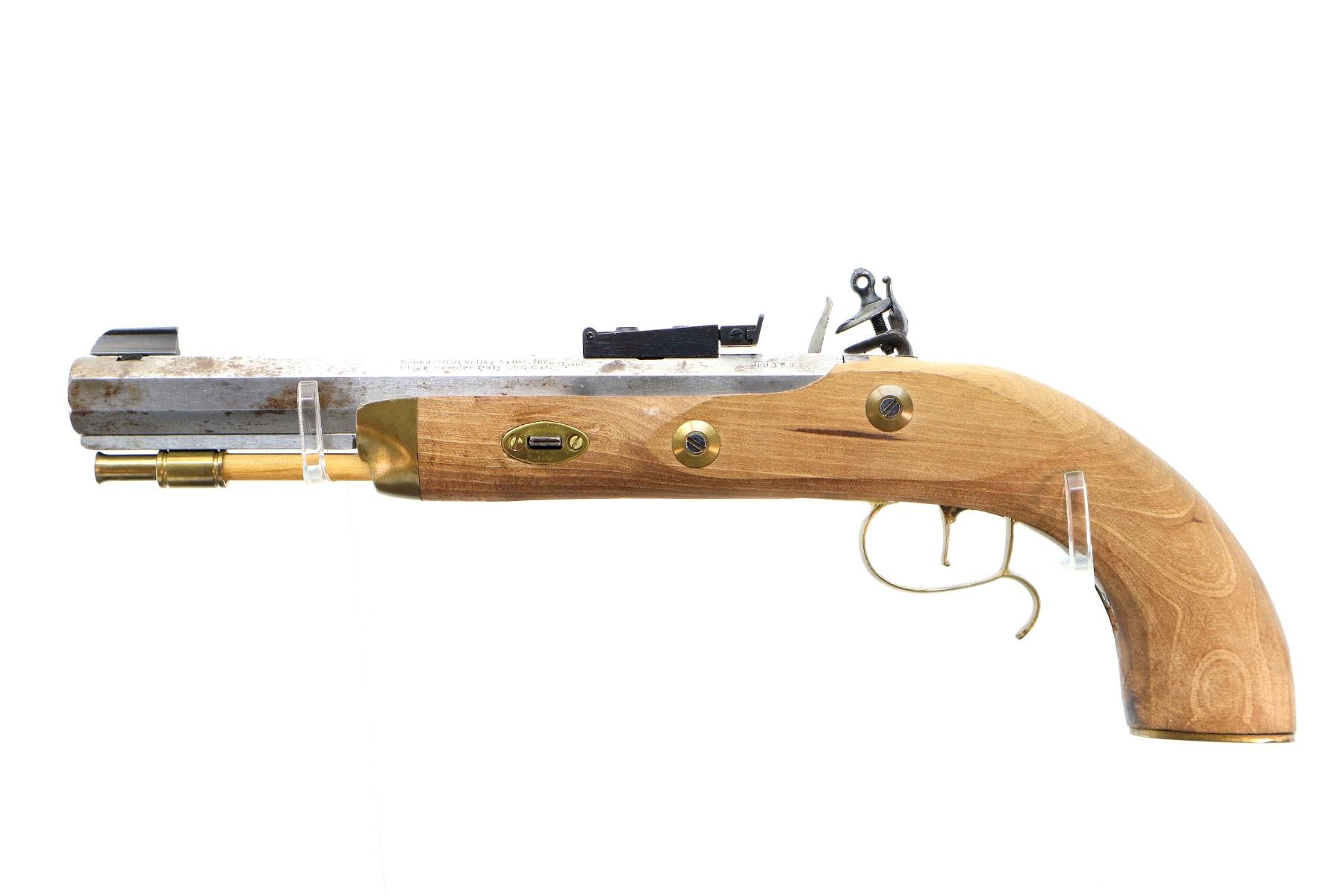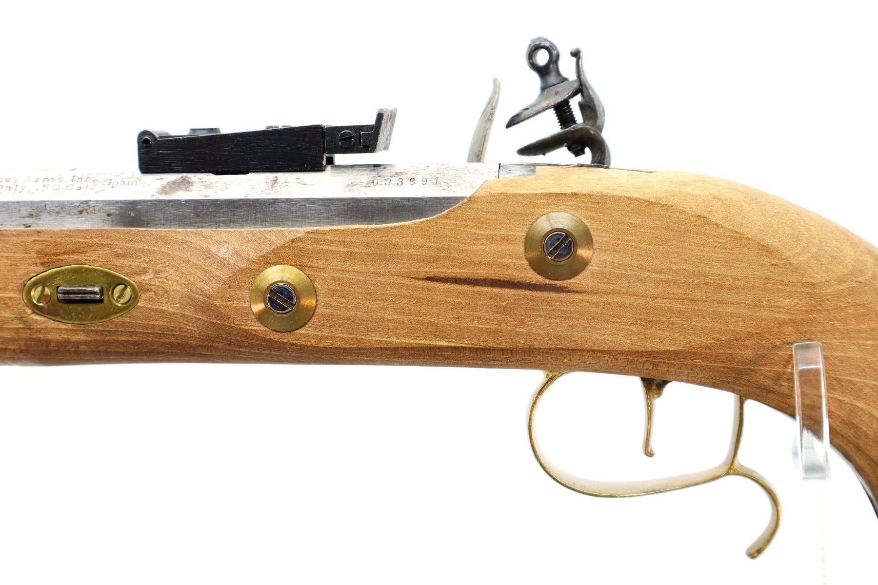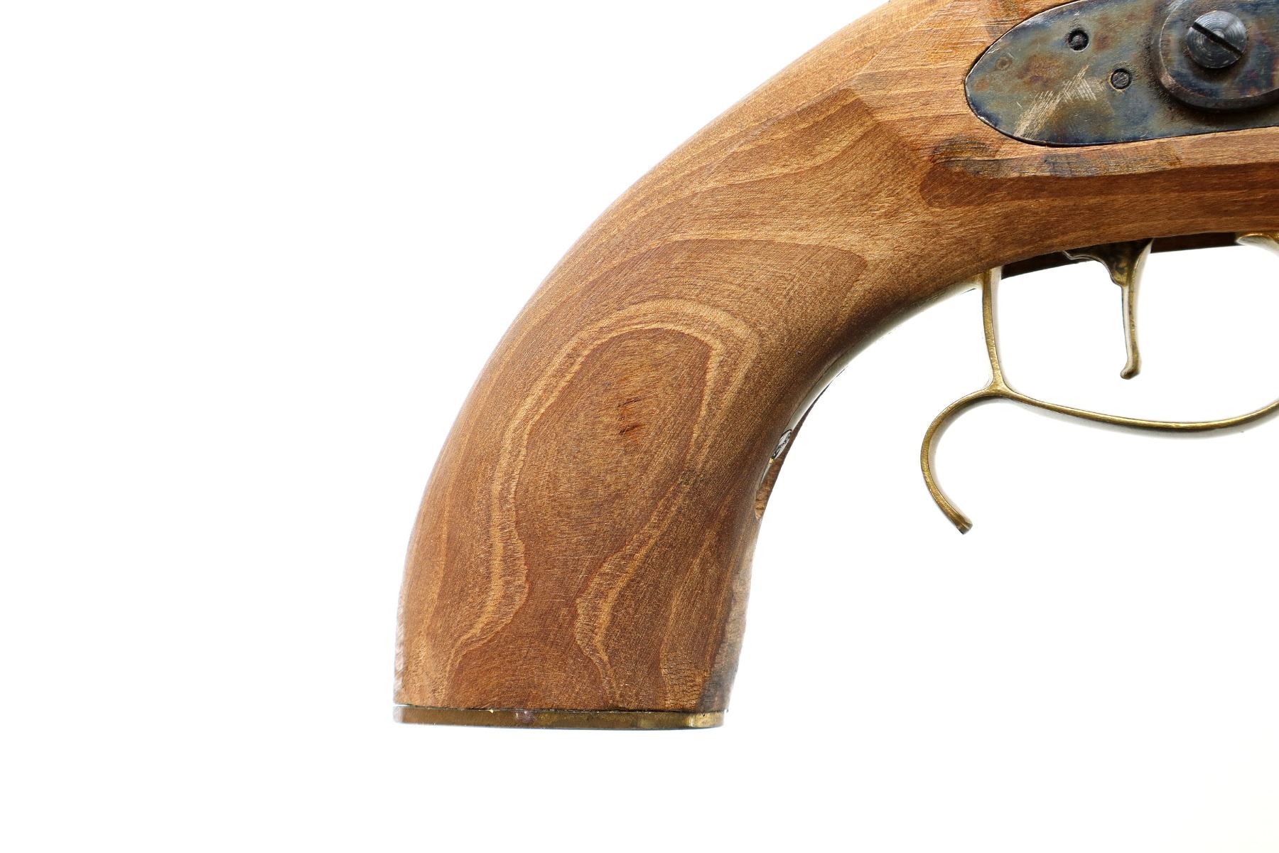 Main Description: This deactivation has 1 visible weld, action does not function. Blade front sight, adjustable u notched rear sight, octagon barrel, colour case hardened lock and hammer. One piece wood grip, single forearm wedge, engraved brass pommel cap, finger rest trigger guard, brass nose cap and wood ramrod with brass tip.