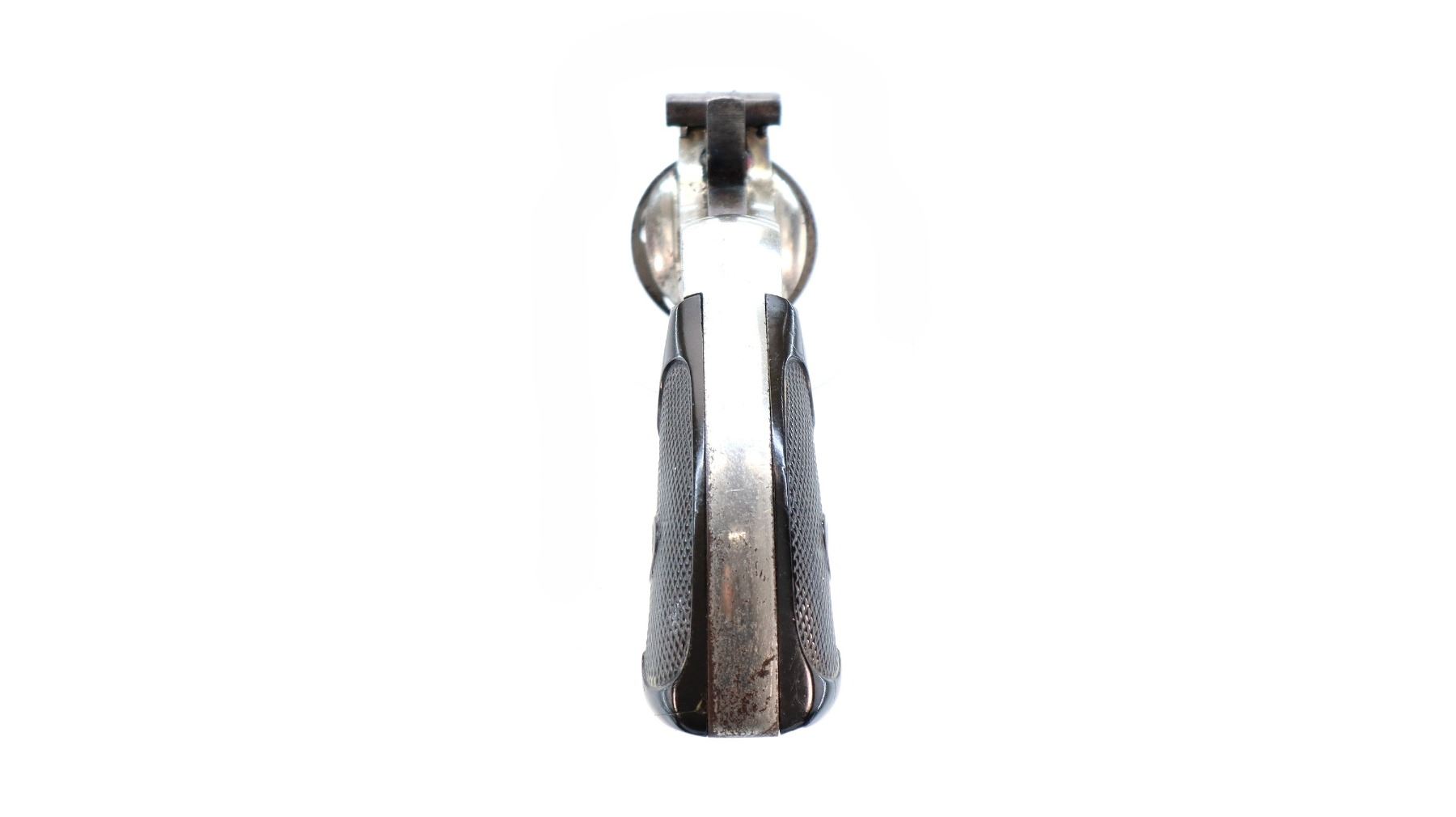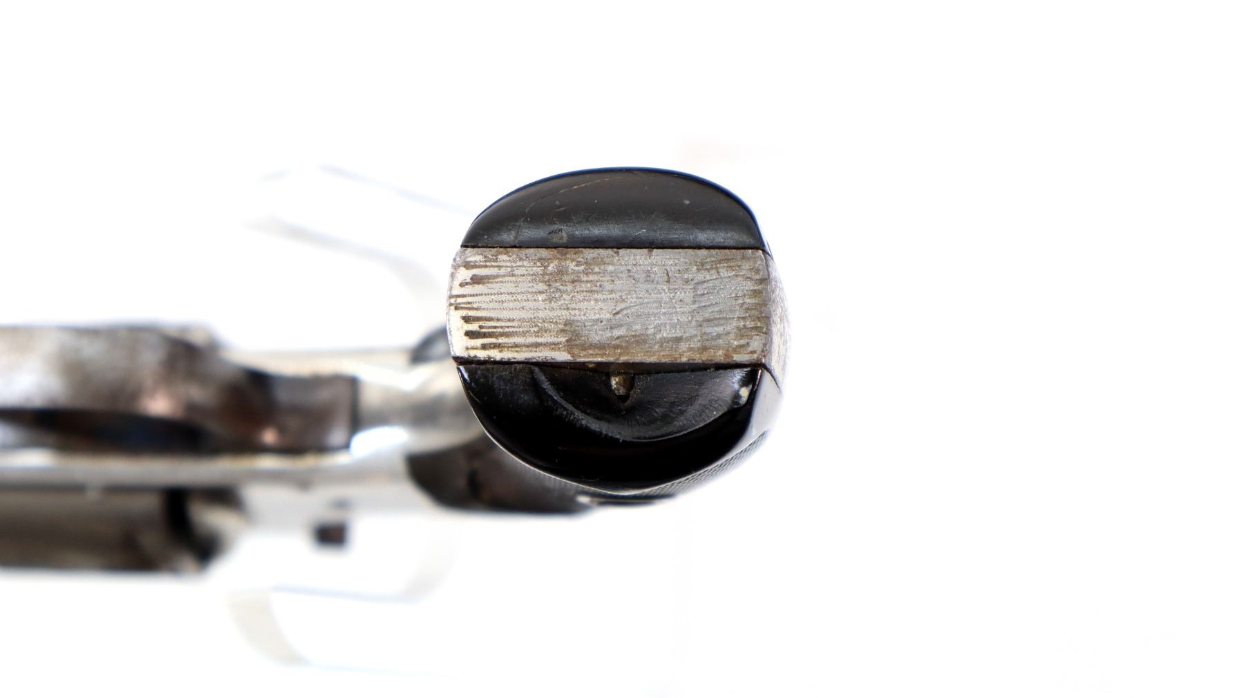 Main Description: This deactivation has a weld at the muzzle and rear of frame, hammer and trigger function cylinder does not turn, cannot be disassembled. Blade front sight, fixed u notched rear sight, Nickel finish, solid rib on barrel, checkered spur hammer and smooth trigger. Two piece checkered black polymer grips right side is chipped