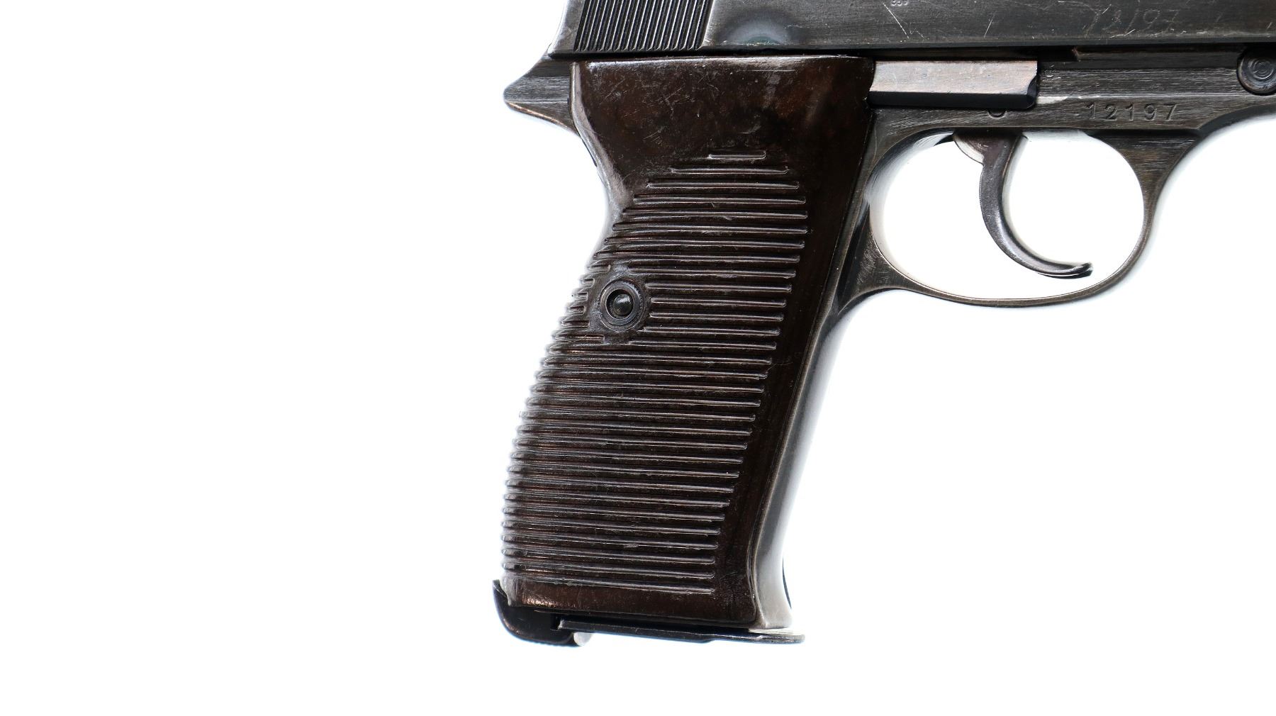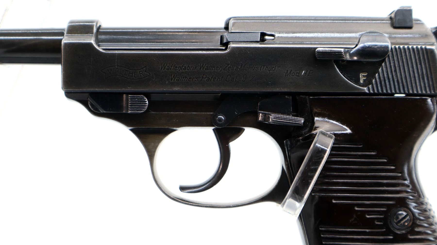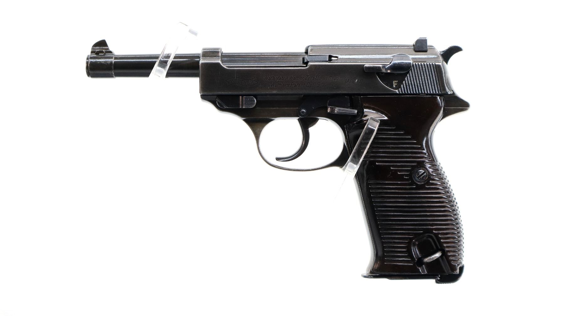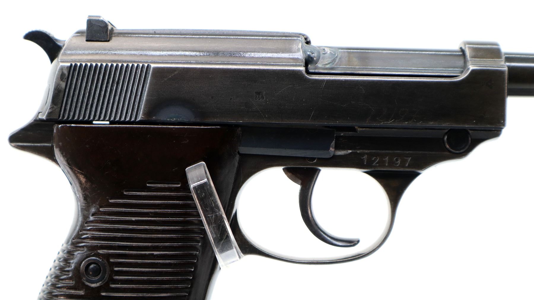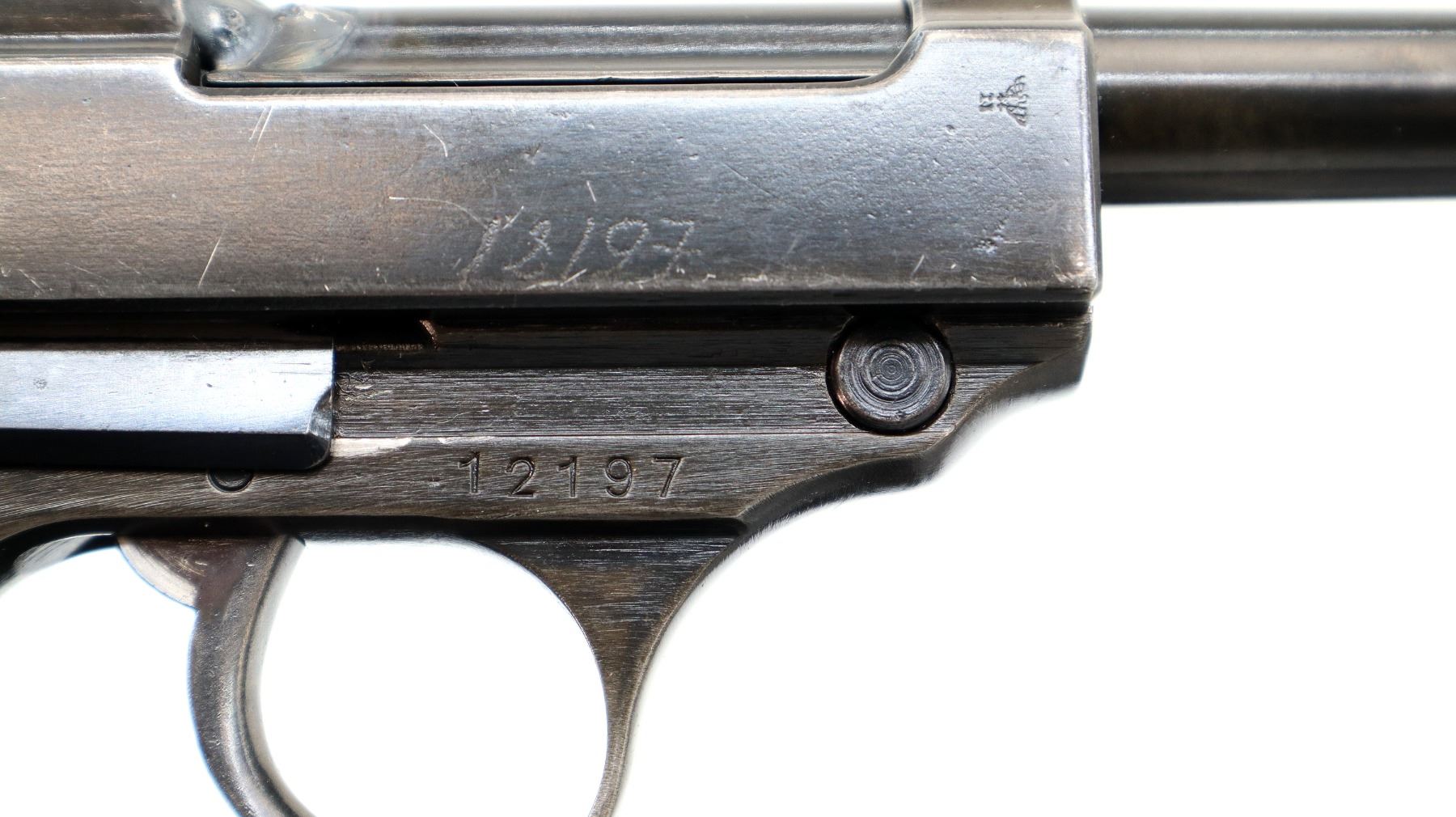 Main Description: This deactivation has one visible weld action does not function, magazine does not come out, cannot be disassembled. Manufactured by Walther, visible serial numbers match. Blade front sight with ramp, u notched rear sight, blued finish, grooved spur hammer. Two piece grooved brown polymer grips, heel mag release, lanyard ring.