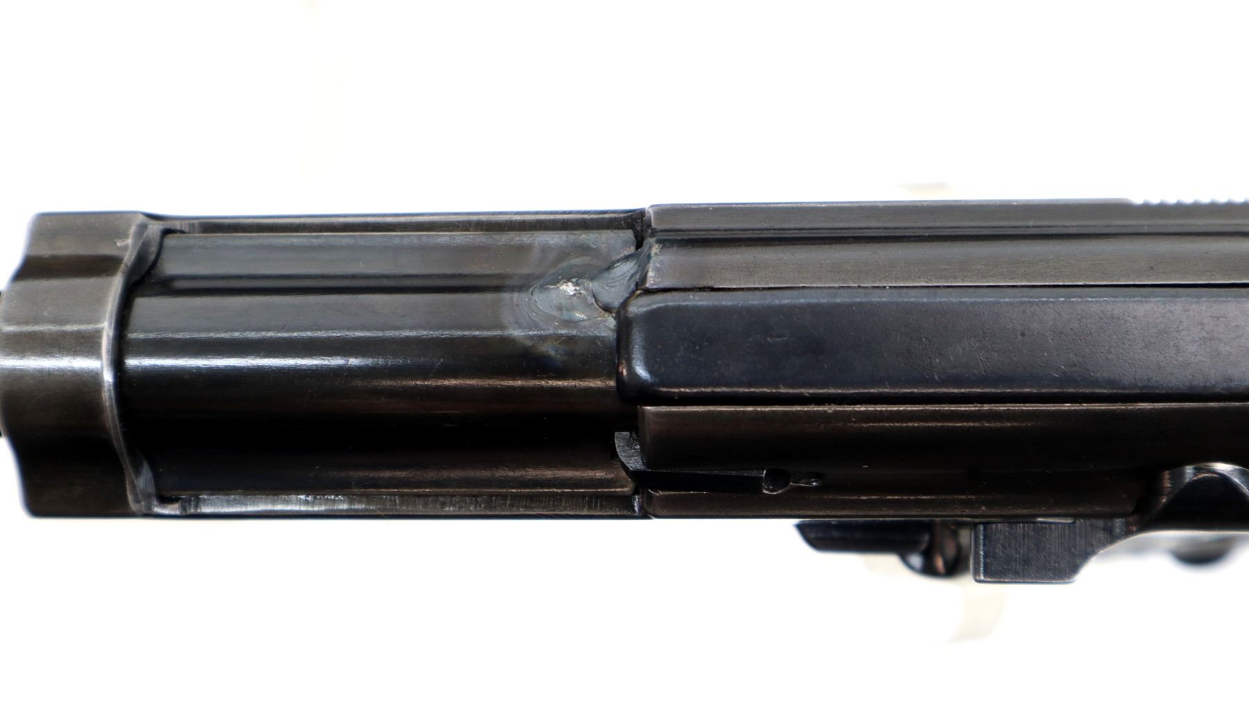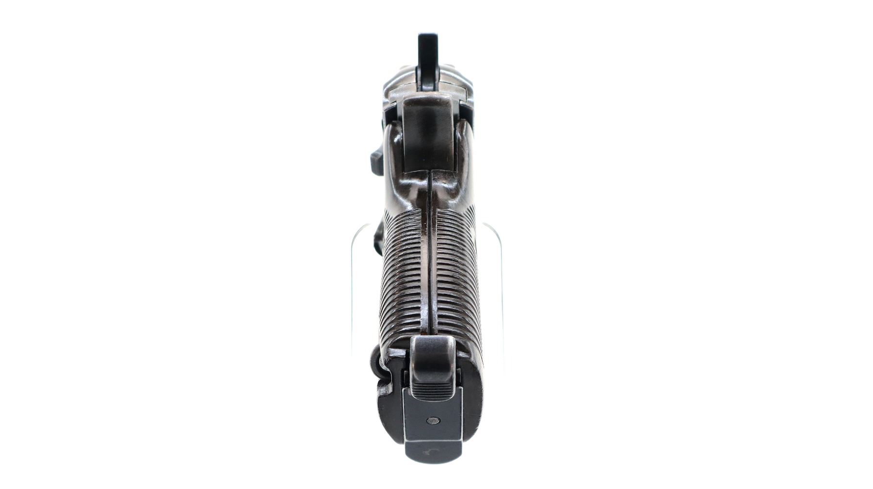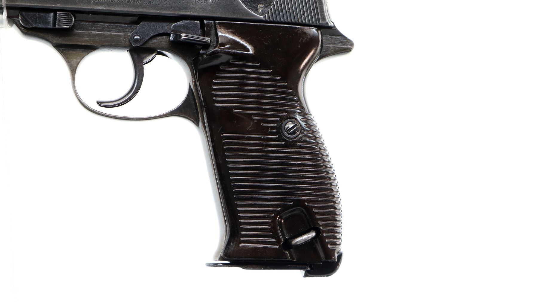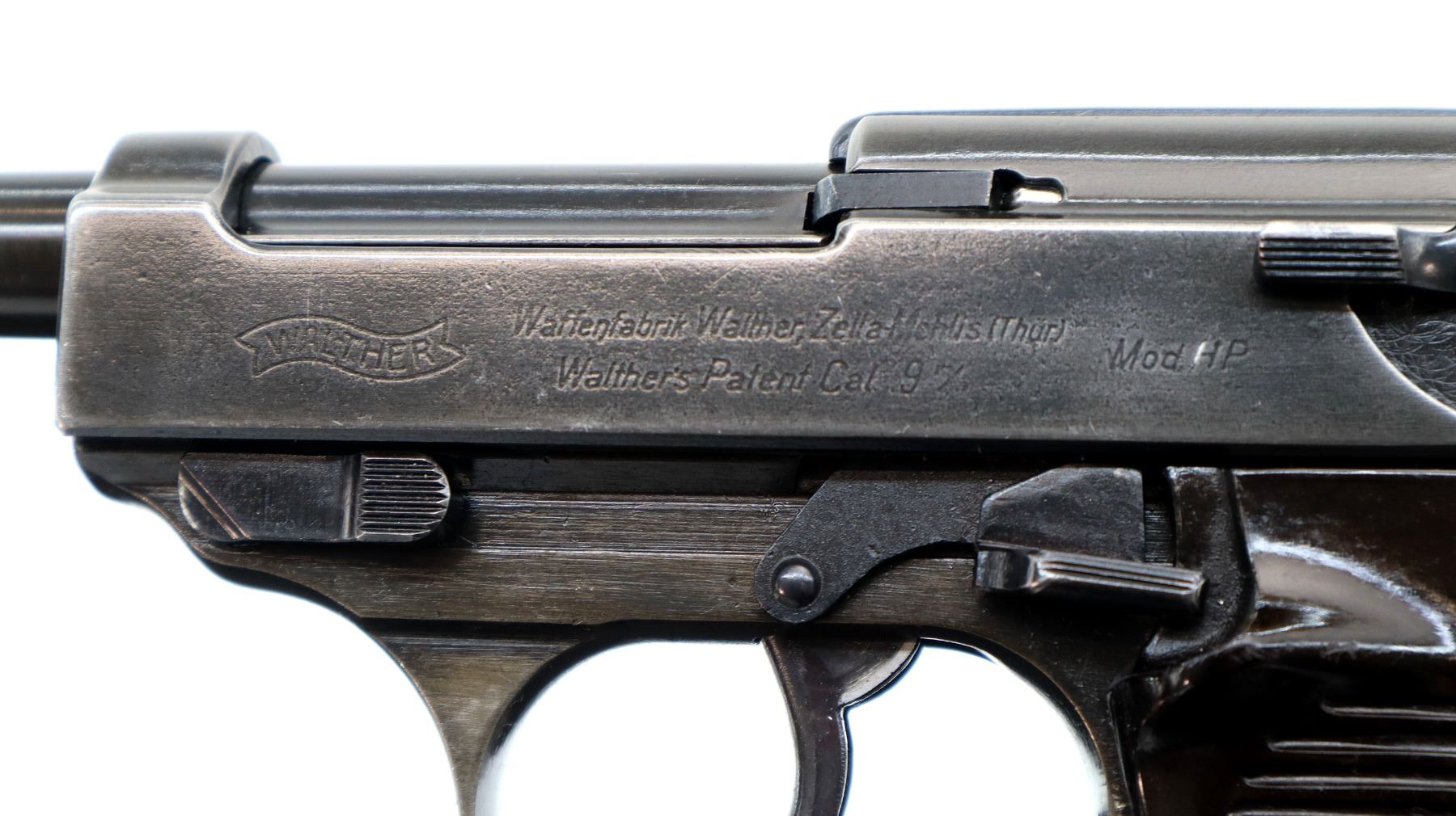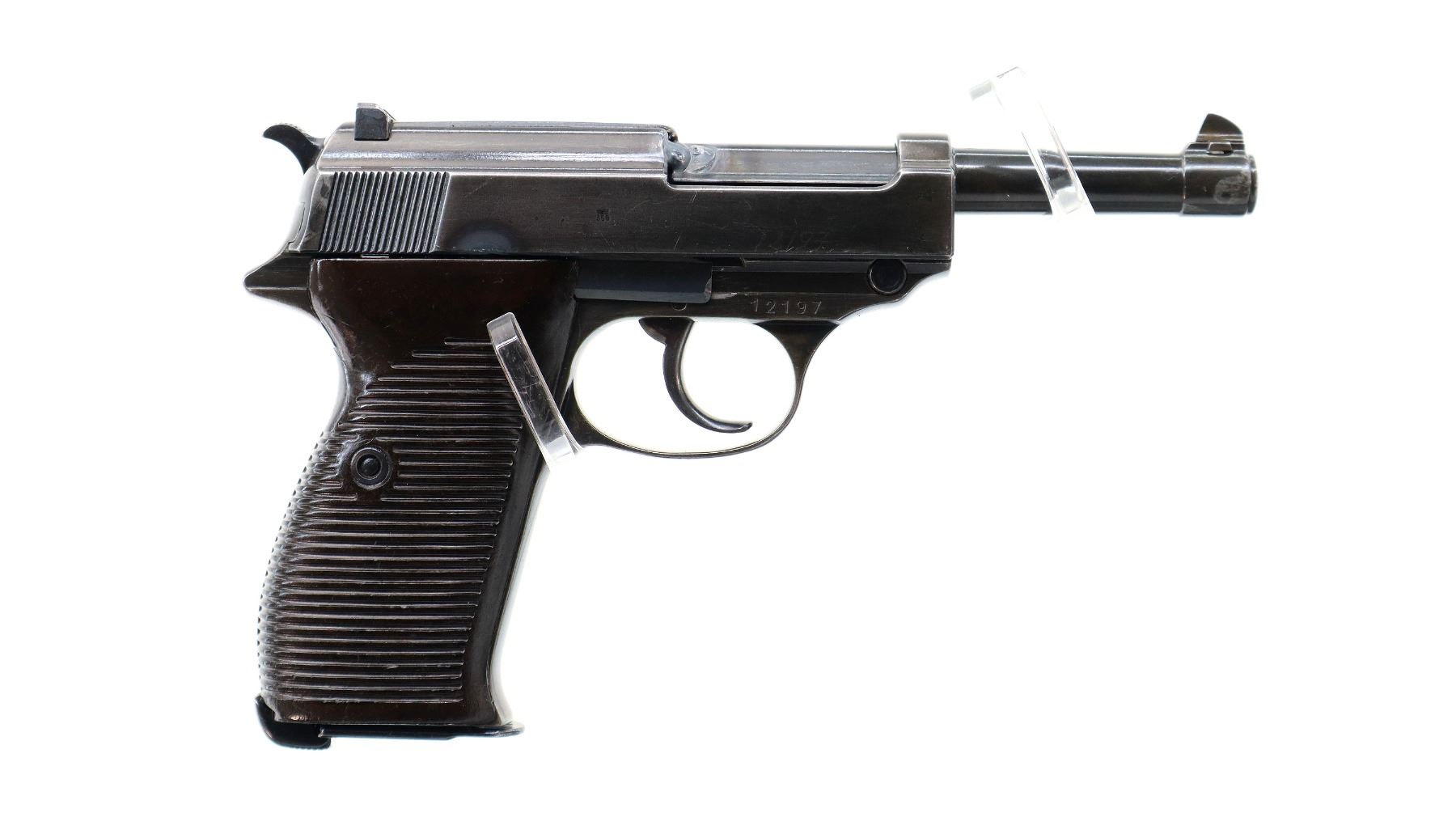 Main Description: This deactivation has one visible weld action does not function, magazine does not come out, cannot be disassembled. Manufactured by Walther, visible serial numbers match. Blade front sight with ramp, u notched rear sight, blued finish, grooved spur hammer. Two piece grooved brown polymer grips, heel mag release, lanyard ring.