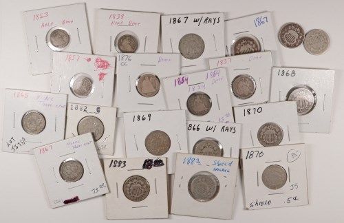 1865 3 CENT-VF, 1867 3 CENT-FINE, ( 2 ) 1882 NICKELS-GOOD, 1883 SHIELD NICKEL-VG, 1869 NICKEL GOOD, 1866 RAYS NICKEL VG, 1870 NICKEL GOOD, 1870 NICKEL VG, 1868 NICKEL GOOD, 1854 DIME-GOOD, 1876-CC DIME-GOOD, 1857 1/2 DIME-VG, 1837 NO STARS DIME-AG, 1853 HALF DIME-GOOD, 1838 NO DRAPERY 1/2 DIME-GOOD, 1867 RAYS NICKEL-VG, 1867 NO RAYS NICKEL GOOD, 1872 NICKEL GOOD, 1866 RAYS NICKEL-GOOD, WHAT A LOT!! ESTIMATE, $450.00+