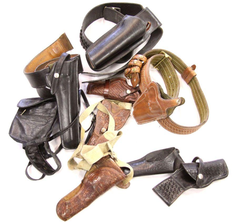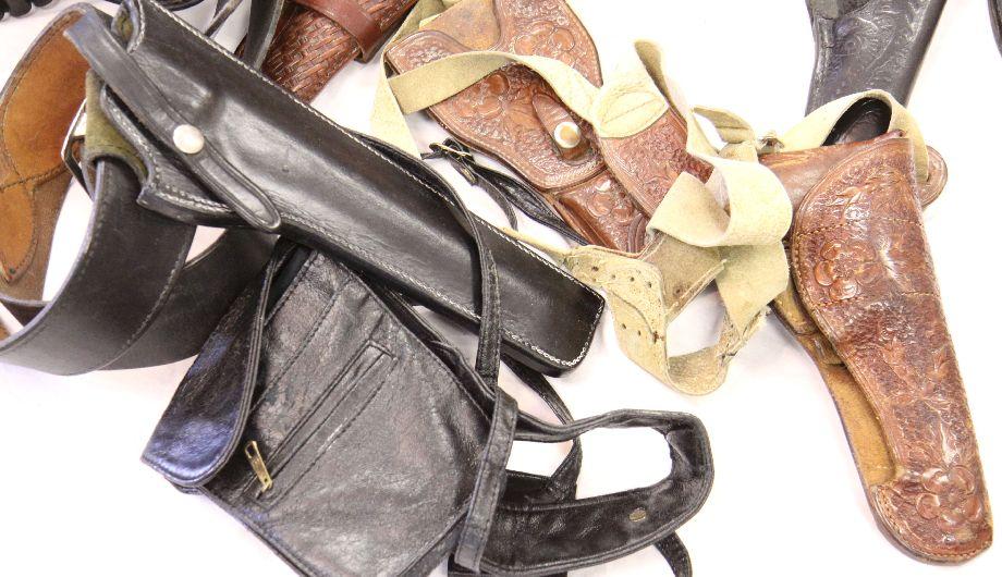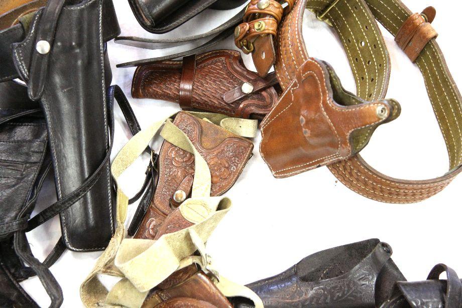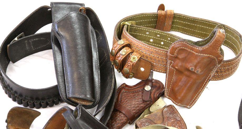 Three leather gun belts, with holsters, in very good condition. Also, two shoulder holster rigs, and three belt holsters. All in good to very good condition, and of quality construction.