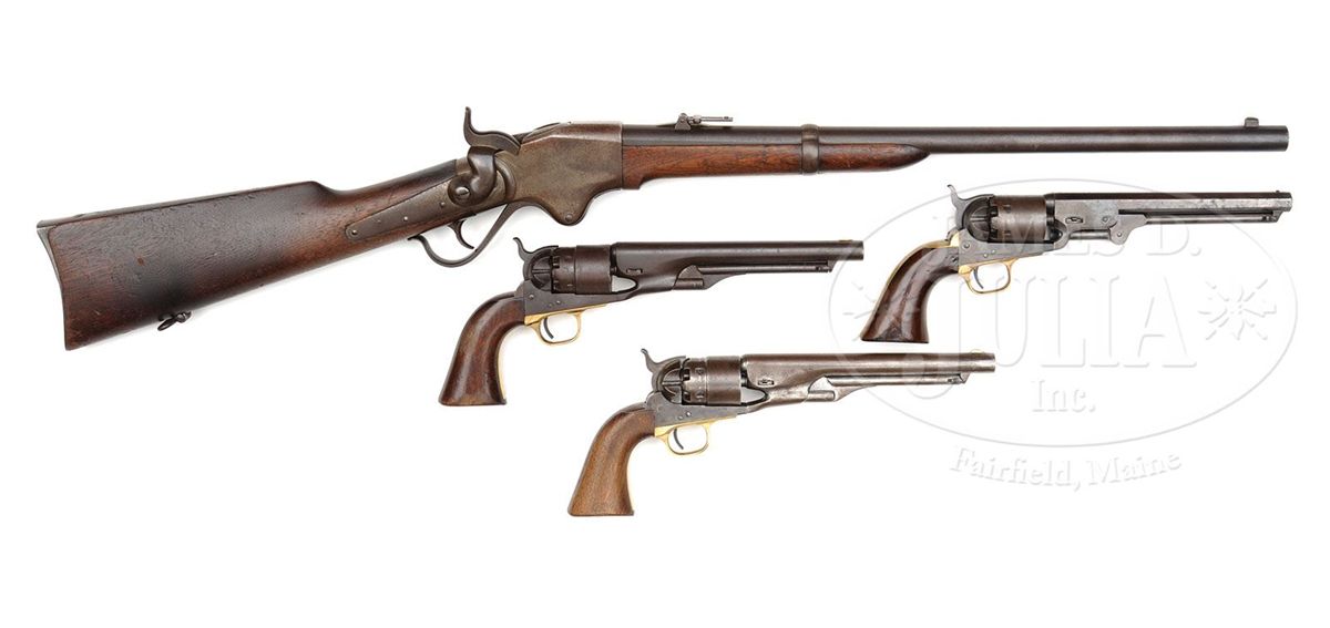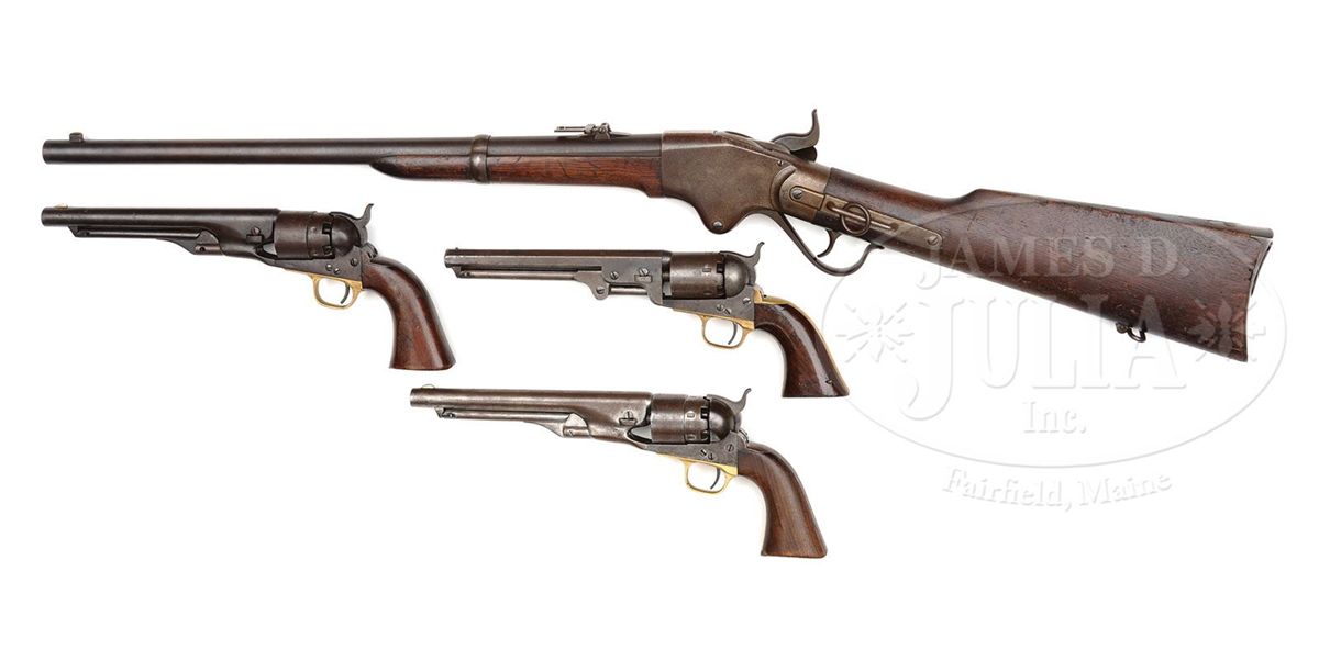 SN 125932; 130459; 178650; 51157. This group consists of two Model 1860 Colt Armies, a Colt Model 1851 Navy, and a Model 1860 Spencer Carbine. All guns appear all orig. Both Colt Armies are made late in 1863, SN 125932 is martially marked, with good discernible cartouches; SN 130459 is civilian. Colt Navy SN 178650 is made early in 1864 with some orig blue finish and cylinder scene. Carbine is also very good with good markings and discernible cartouches. CONDITION: Army SN 125932 - good overall; all matching SNs; metal is gray overall; SNs, bbl address and frame marking all discernible; cylinder scene is about 25% discernible; hammer retains case colors where protected and appears to be a more contemporary replacement; stocks are sound and solid with many small dents and dings on butt where gun was used as a tack hammer, cartouches are both discernible; mechanically gun functions with good rifling. Army SN 130459 - good overall; traces of blue are found in well on bbl; gun overall is brown with areas of staining and pitting; SNs match with exception of wedge which is numbered 5066; bbl housing SN is weak though matching; grips are sound and well fit, retaining about half of their orig varnish; cyl scene is about 25% discernible; gun functions mechanically with good sharp bore, lever screw is broken off but enough remains that lever still functions. Navy SN 178650, very good overall, retaining 10% blue finish, especially in protected areas; balance of gun has scattered staining and pitting but markings are all crisp; "Colt's Patent" on frame is double struck and quite discernible; cylinder scene is mostly intact upon close observation with areas of staining and pitting; gun mechanically is functional with good discernible rifling; stocks retain about 70% of their varnish. Spencer carbine SN 51157, very good overall, appearing "as found"; bbl is brown overall; frame and lock are gray/brown with scattered staining and pitting; 3-line maker's mark on breech is weak on the right side, as can be seen in photos, though 80% of mark is well struck; 2 inspector cartouches are discernible in stock with shown numerous nicks, dings and abrasions; gun functions mechanically well and breech still retains some case colors where protected; bore is very good with crisp discernible rifling. 4-47318 JS6