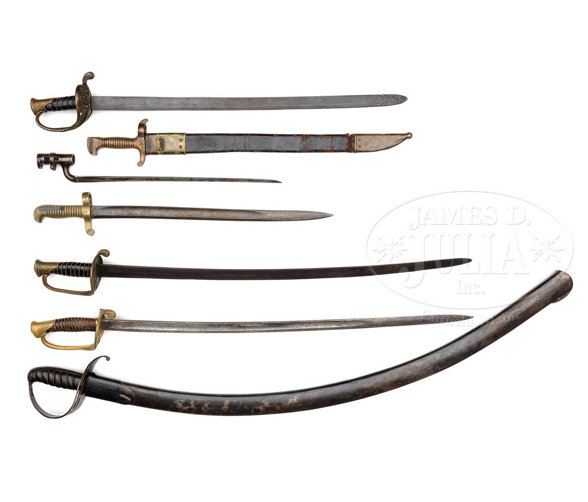 This lot consists of an orig Confederate foot officer's sword, possibly Leech & Rigdon; an orig Boyle & Gamble saber bayonet;an orig saber bayonet for Remington Zouave Rifle; an orig Enfield Angular bayonet; an orig foot officer's sword with plain quillon, of unknown attribution; reproduction Virginia Manufactory cavalry saber; and reproduction Confederate staff officer's sword with "CS" and star cast in hilt. PROVENANCE: Dr. Andrew Kelley Collection. CONDITION: Confederate foot officer's sword has a flower design cast in bottom of guard, typical of Leech & Rigdon products. Florally decorated hilt has good patina. Grip appears to be orig, retaining most of its orig leather with minor scuffs and wear at high areas and orig single strand brass wire. 30" blade has unstopped fuller, overall brown with staining, pitting and old sharpening. Boyle & Gamble saber bayonet has 18" blade that is heavily cleaned, buffed and pitted. Hilt has numerous dings and dents and staining but still maintains its orig shape, including round muzzle ring. Lock appears to be restored. Scabbard is 19th century and not a product of Boyle & Gamble. Scabbard leather has old glued repair where broken in half and is about to break again just above drag. Zouave & Enfield bayonets are v.8 with gray baldes.Civil War foot officer's sword with two floral branches has a plain quillon, typical of Confederate swords, however 30" blade has stopped fuller and is quite similar to products made by Ames. Grip retains most of its orig leather and remnants of orig dyed surface and all orig single brass wire. Reproduction swords are overall good condition. Virginia Manufactory has scabbard. 4-48850, 4-48852, 4-48854, 4-48856, 4-48857, 4-48858 JS13