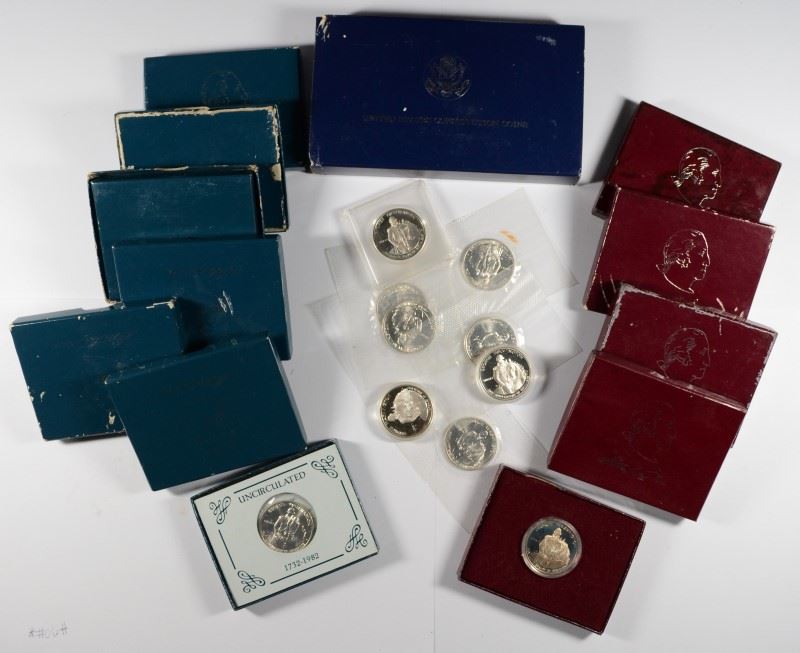 1987 CONSTITUTION SILVER DOLLAR, ( 12 ) BU 1882 WASHINGTON HALF DOLLARS ( 5 NO BOX ) ( 8 ) PROOF 1982 WASHINGTON HALF DOLLARS, ( 3 NO BOX ) ESTIMATE, $300.00 TO $340.00