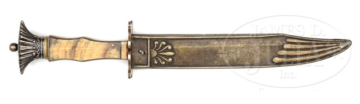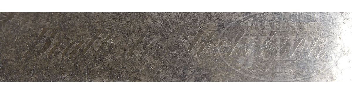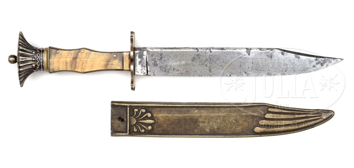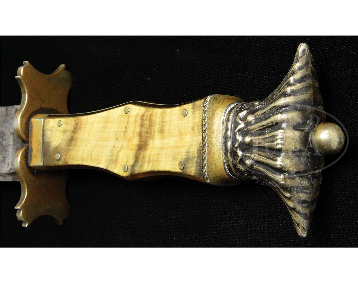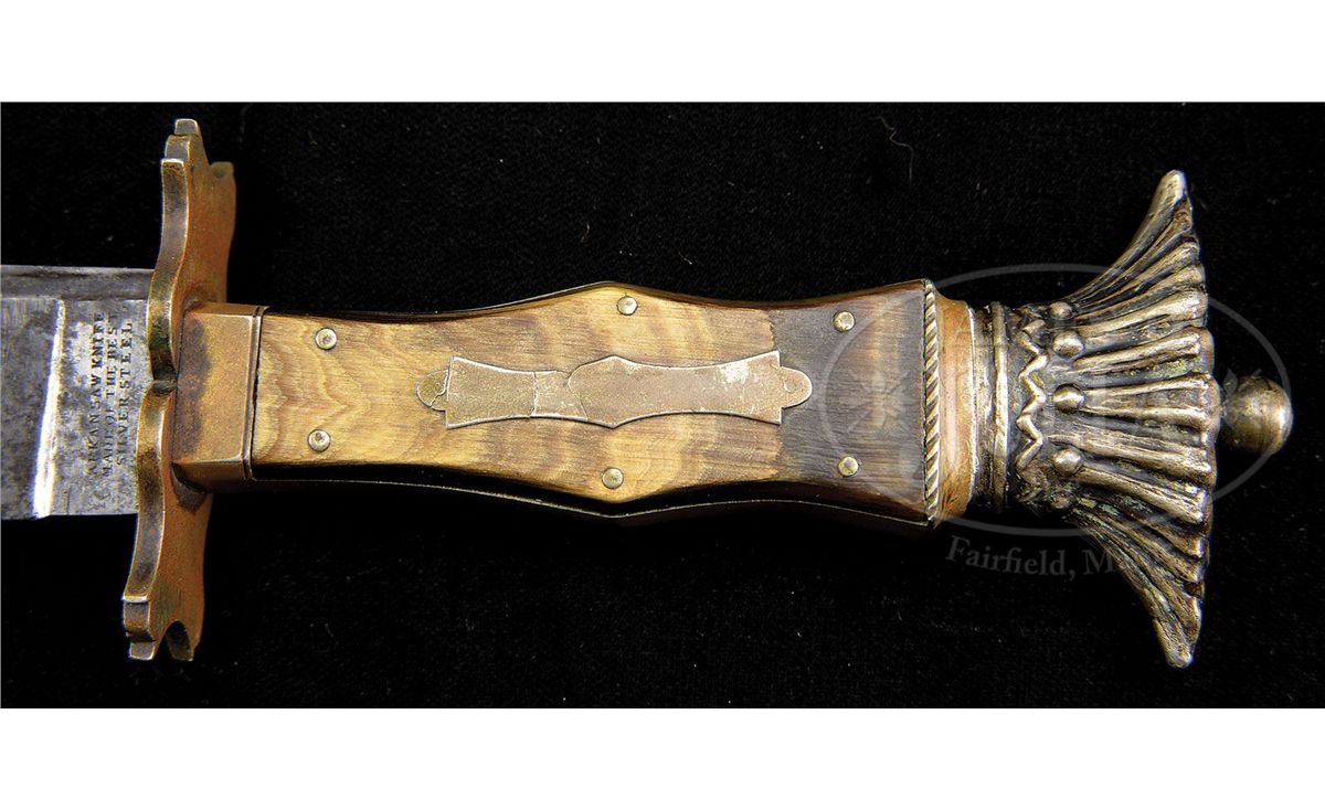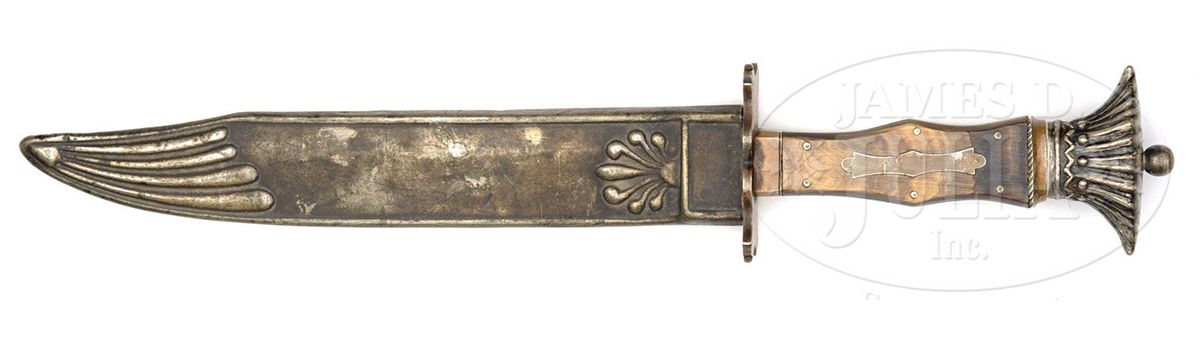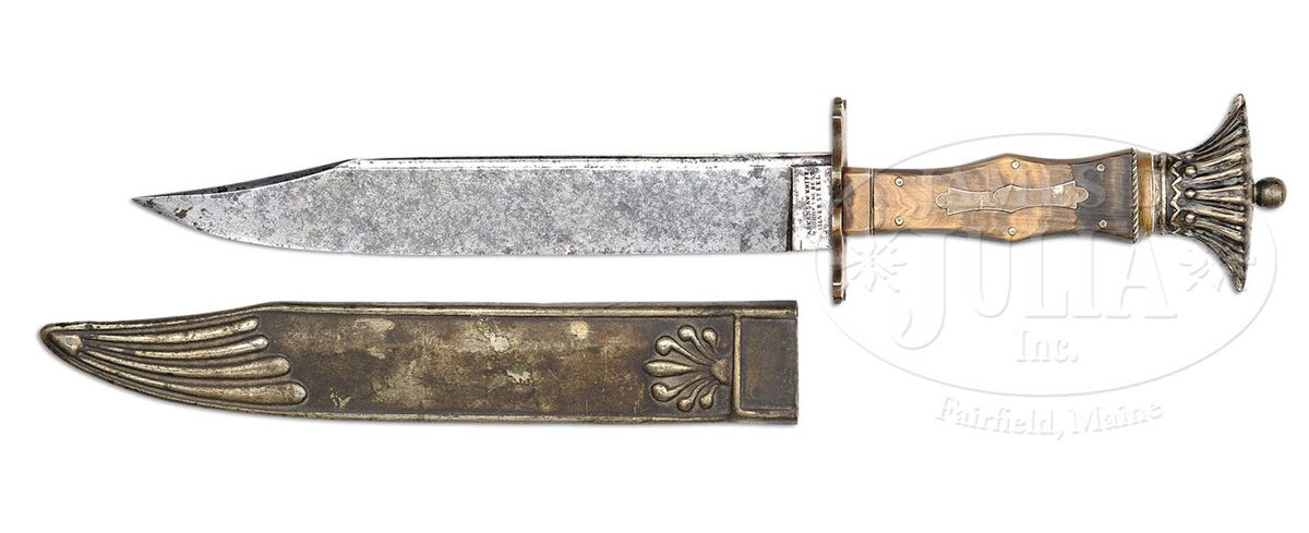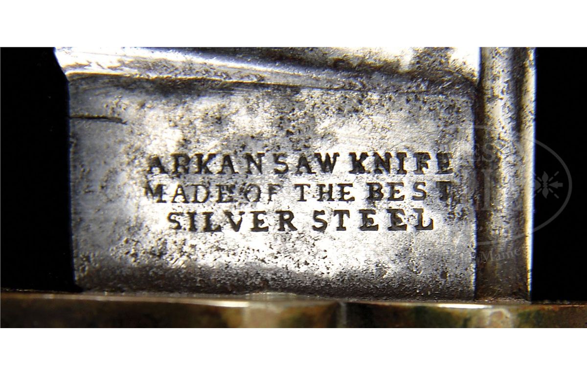 This knife dates among the earliest examples of Sheffield Bowies made for American market circa 1838-1840. “ARKANSAW KNIFE MADE OF BEST SILVER STEEL” markings are seen on only a few knives, all being wrapped coffin hilts, one example shown pg. 42 & 43, Adams, Antique Bowie Knife Book with same thin long fuller not seen on any other knives other than early “Samuel Bell, Knoxville, Tenn” marked Bowies which are thought to be Sheffield imports also. “Death to Abolition” on bowie blade is noted in 1838 article with illustration of blade with horse head pommel. This knife has rarely seen “Indian War Bonnet” pommel which is seen on few other early American Bowies. Knife measures 13-3/4" overall with 8-1/2" clip point blade and almost 3/10” thick at ricasso. If you are interested in one great early American Bowie knife this is your opportunity. CONDITION: Very good-fine overall, markings all discernible as seen in photos, blade still has areas of original polish with areas of staining and pitting, several small nicks in blade. Horn slabs all sound and well fit, mountings retain traces of silver plate. Scabbard is missing frog button and liner with patina and small dents and crack near drag and at throat. 8-76373 JS47
