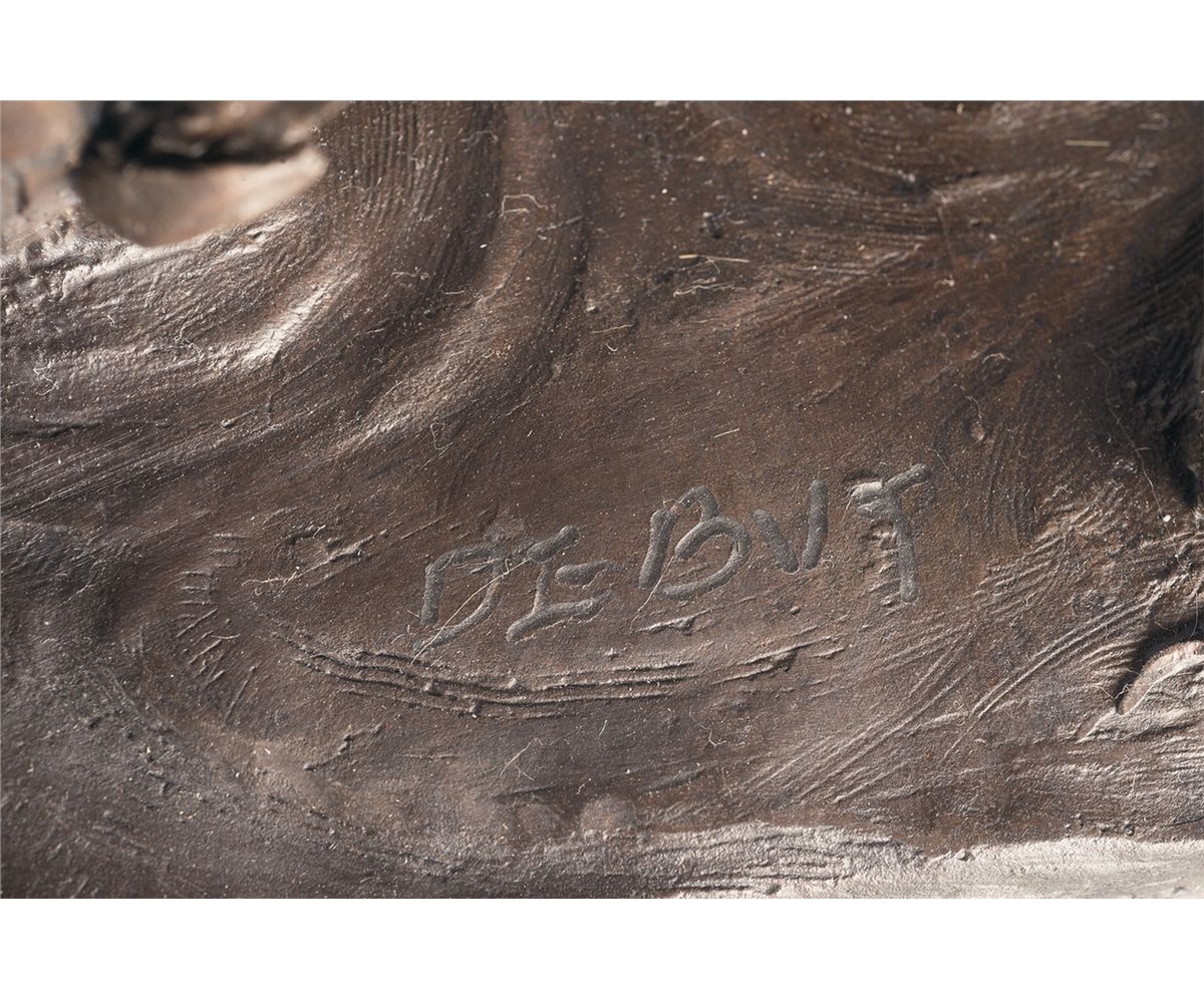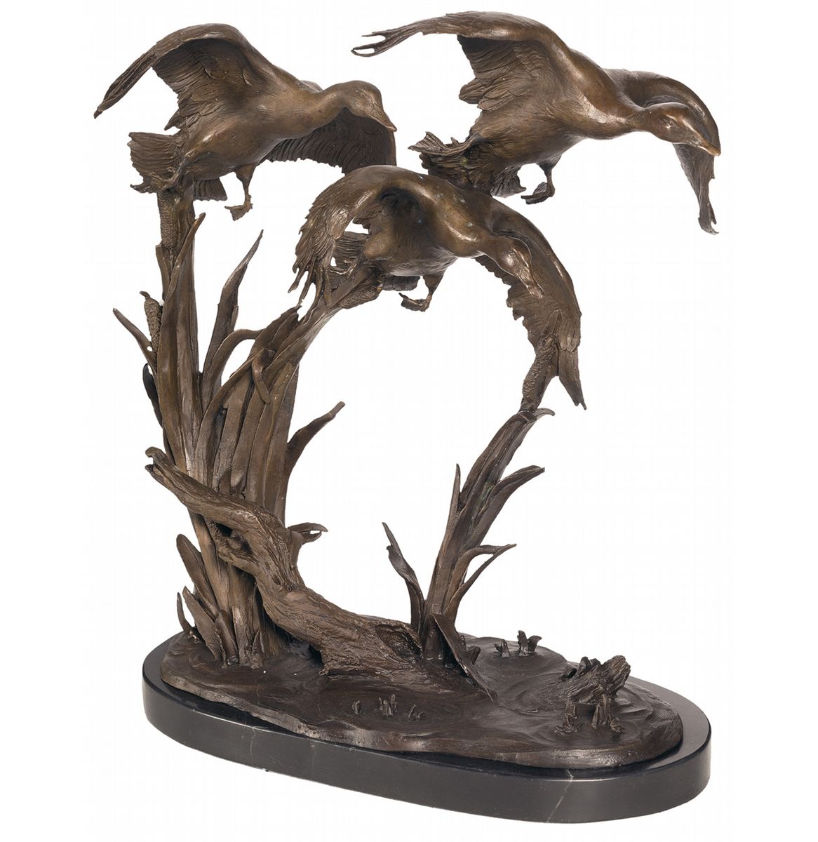 Measuring 17 inches tall and 14 inches long on a 1 1/8 inch tall black marble oval plinth, the sculpture is signed "DEBUT" on the rear and depicts a flight of 3 geese coming in for a landing in a wetlands area.