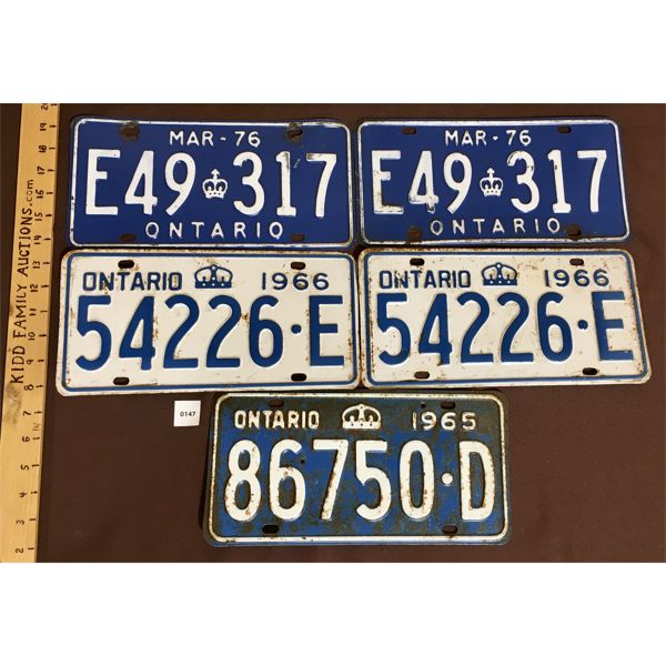 LOT OF 5 - ONTARIO LICENSE PLATES - 1965 TO 1976