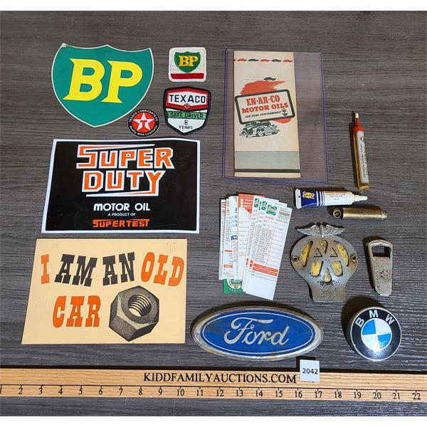 JOB LOT - MISC GAS AND OIL COLLECTIBLES - INCL DECALS, LICENSE PLATE TOPPER, ETC.