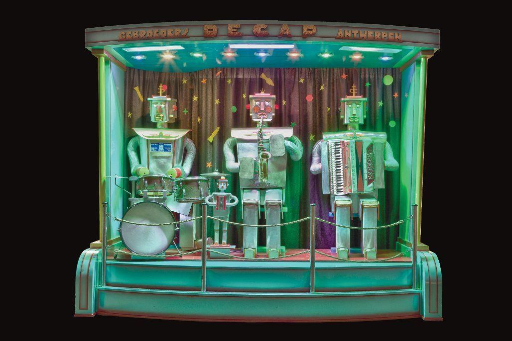 DECAP Robots. One of only five built 92 key DECAP Robots. Matching the trend of the time, DECAP built this danceorgan with 3 fully animated robots. One really plays the percussion and the other the accordion, while the middle one raises and fills his cheeks while playing the saxophone. Very rare and spectacular. With 1 music-wheel. Museum's quality. 332 x 220 x 268cm. DECAP, Antwerp, Belgium, circa 1950.