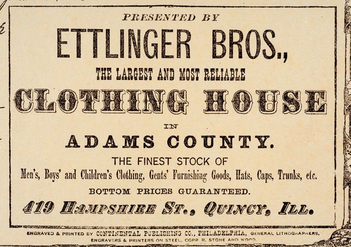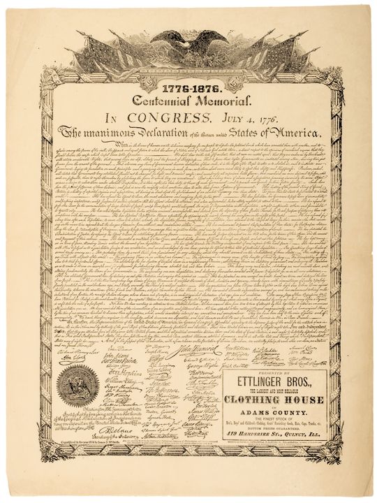 c. 1876, Advertising Broadside: “1776-1876 Centennial Memorial” Declaration of Independence, Copyrighted by James D. McBride, Engraved and Printed by the Continental Publishing Co., Philadelphia, PA. This detailed document celebrates the United States’ centennial by reproducing the Declaration of Independence and its facsimile signatures. 19.5” x 14.5”, printed in black on thin, cream-colored paper. Atop is the image of an eagle flanked by American flags. In the lower left-hand corner is the Department of the Interior’s seal and a facsimile signature by the Secretary of the Interior, certifying that this is a “Fac.Simile of the original...” Very light age toning and numerous storage folds, but in otherwise very nice condition. This impressive piece was printed by the Continental Publishing Company of Philadelphia as a Centennial Memorial to the signing of the Declaration of Independence. In the lower right-hand corner is an advertisement for “Ettlinger Bros., The Largest and Most Reliable Clothing House in Adams County... Quincy, Ill.” Interestingly, a tiny notice at the bottom of the broadside offers a plate paper version with a red seal and no advertising panel--for only one dollar!